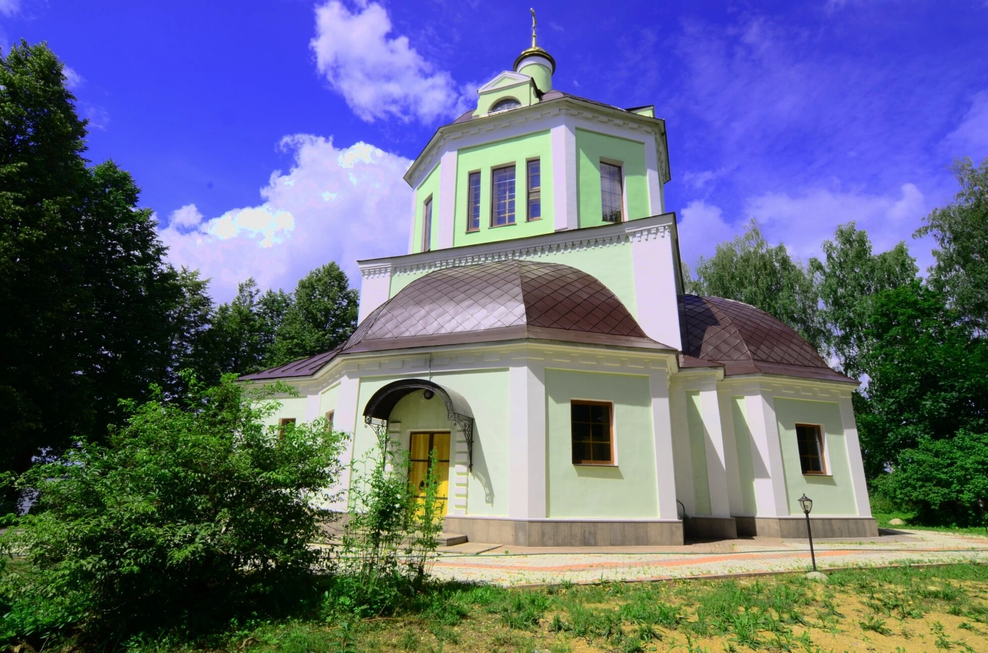 Здание церкви выполнено в традициях классицизма с характерной для этого стиля строгостью форм и гармоничностью пропорций. Основной объем храма имеет восьмигранную форму, увенчанную массивным куполом, что создает впечатление монументальности и величия. Фасад здания окрашен в благородные светло-зеленые тона с белыми декоративными элементами, что придает храму особую выразительность на фоне окружающего пейзажа.