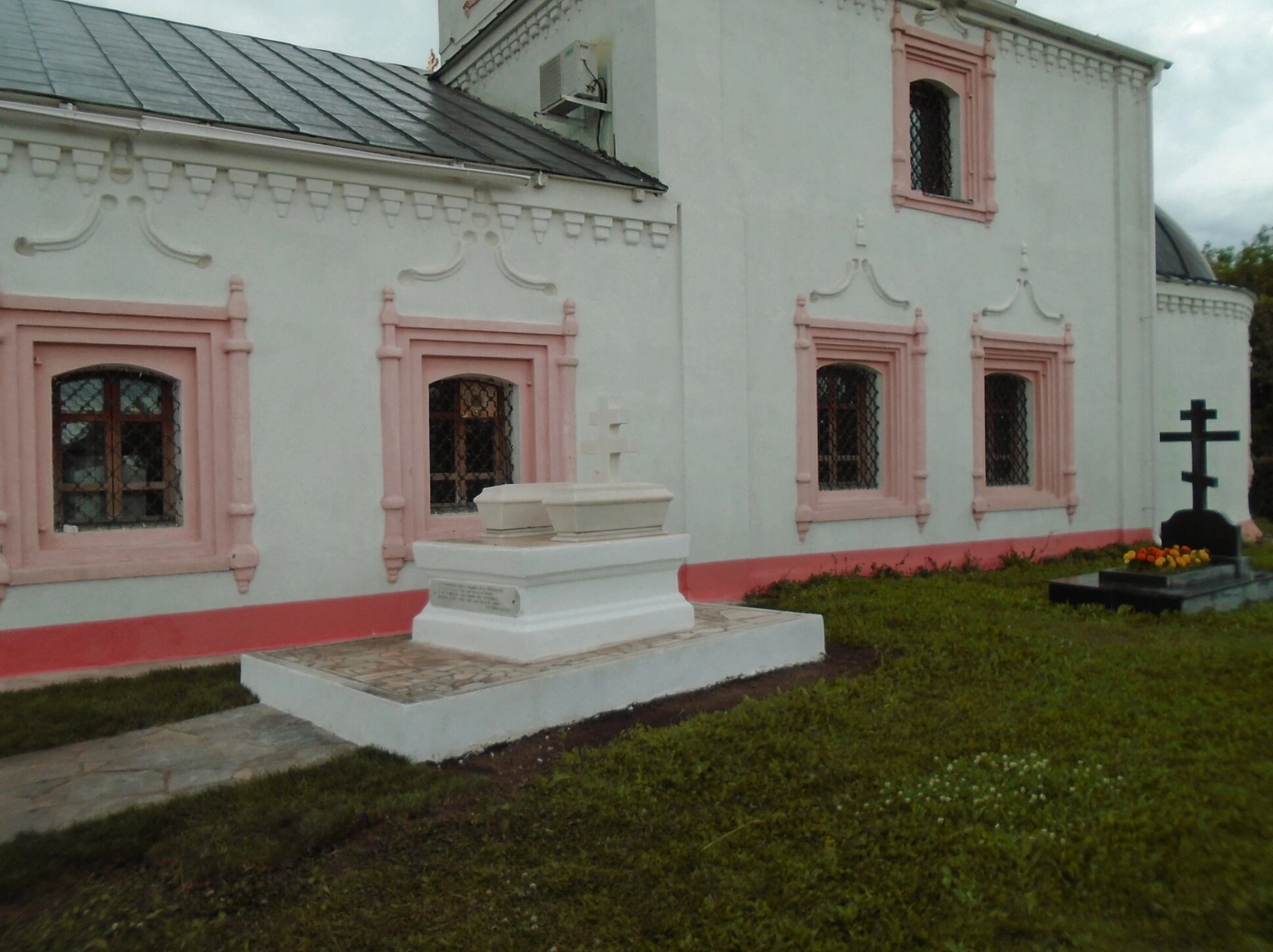 На переднем плане фотографии видна зеленая лужайка, а справа — два надгробия. Одно из них представляет собой светлый прямоугольный памятник на белом основании, другое — темное надгробие с черным крестом и цветником. Эти захоронения, возможно, принадлежат родителям великого русского поэта Гавриила Романовича Державина, которые покоятся рядом с церковью.