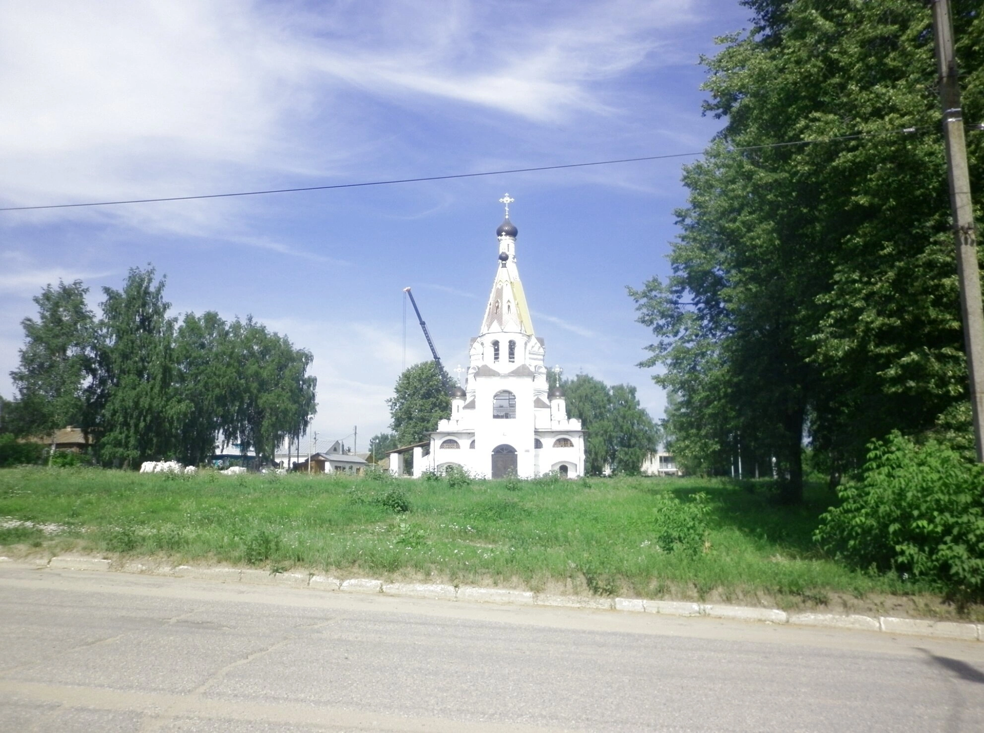 На переднем плане фотографии видна асфальтированная дорога, ведущая к храму, и зелёная обочина, что подчёркивает доступность святыни для паломников и местных жителей. Церковь Богоявления в Красном-на-Волге имеет богатую историю и является не только архитектурной доминантой, но и важным духовным центром, сохраняющим православные традиции костромской земли.