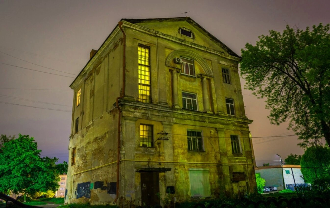 Особое внимание приковывает разнообразие оконных проёмов. На верхнем ярусе расположены высокие узкие окна, одно из которых в момент съёмки было озарено внутренним светом, что создаёт впечатление живой молитвенной жизни внутри храма. Окна среднего этажа украшены арочными завершениями и декоративными колоннами, что подчёркивает сакральный характер архитектуры. В нижней части фасада, к сожалению, видны следы повреждений и граффити, напоминающие о необходимости бережного отношения к историческому наследию.