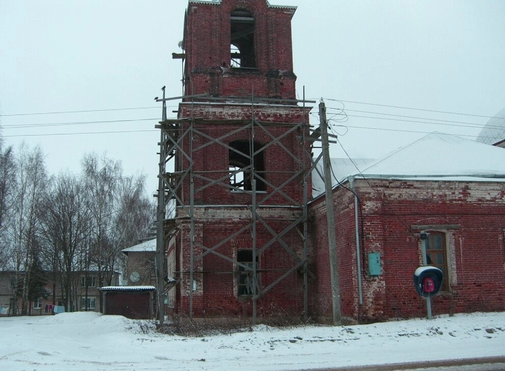 Храм представляет собой кирпичное здание, выполненное в традициях русской церковной архитектуры. На снимке отчетливо видны строительные леса, установленные на колокольне, что свидетельствует о проведении реставрационных работ или консервации памятника архитектуры. Такие меры предпринимаются для сохранения исторического облика православной святыни для будущих поколений.