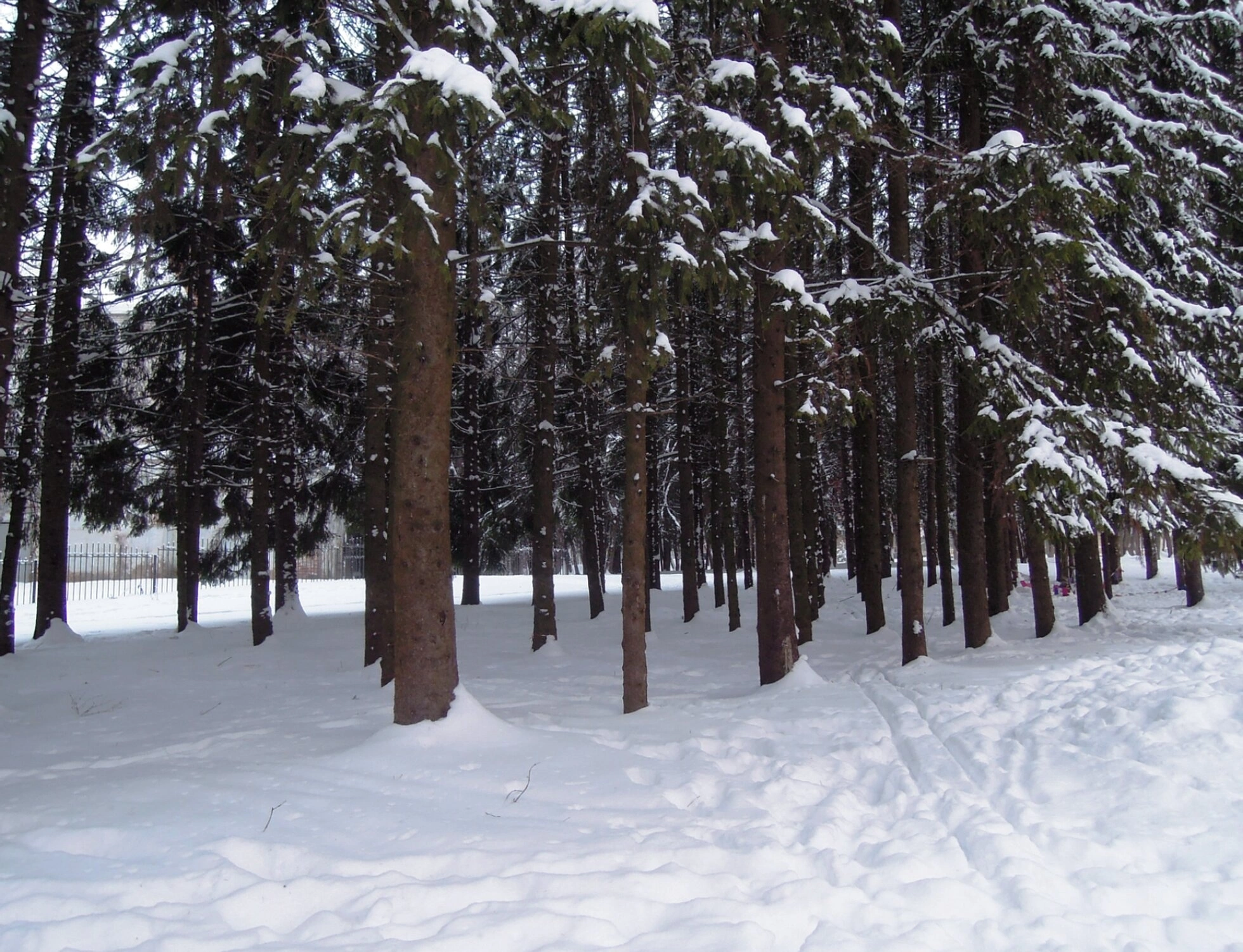 Храм представлен в зимнем убранстве, окруженный высокими хвойными деревьями, ветви которых склонились под тяжестью снежного покрова. Белоснежный покров окутывает землю и архитектурные формы храма, символизируя духовную чистоту и благодать. На переднем плане видны следы на снегу, вероятно оставленные прихожанами, направляющимися к святому месту.