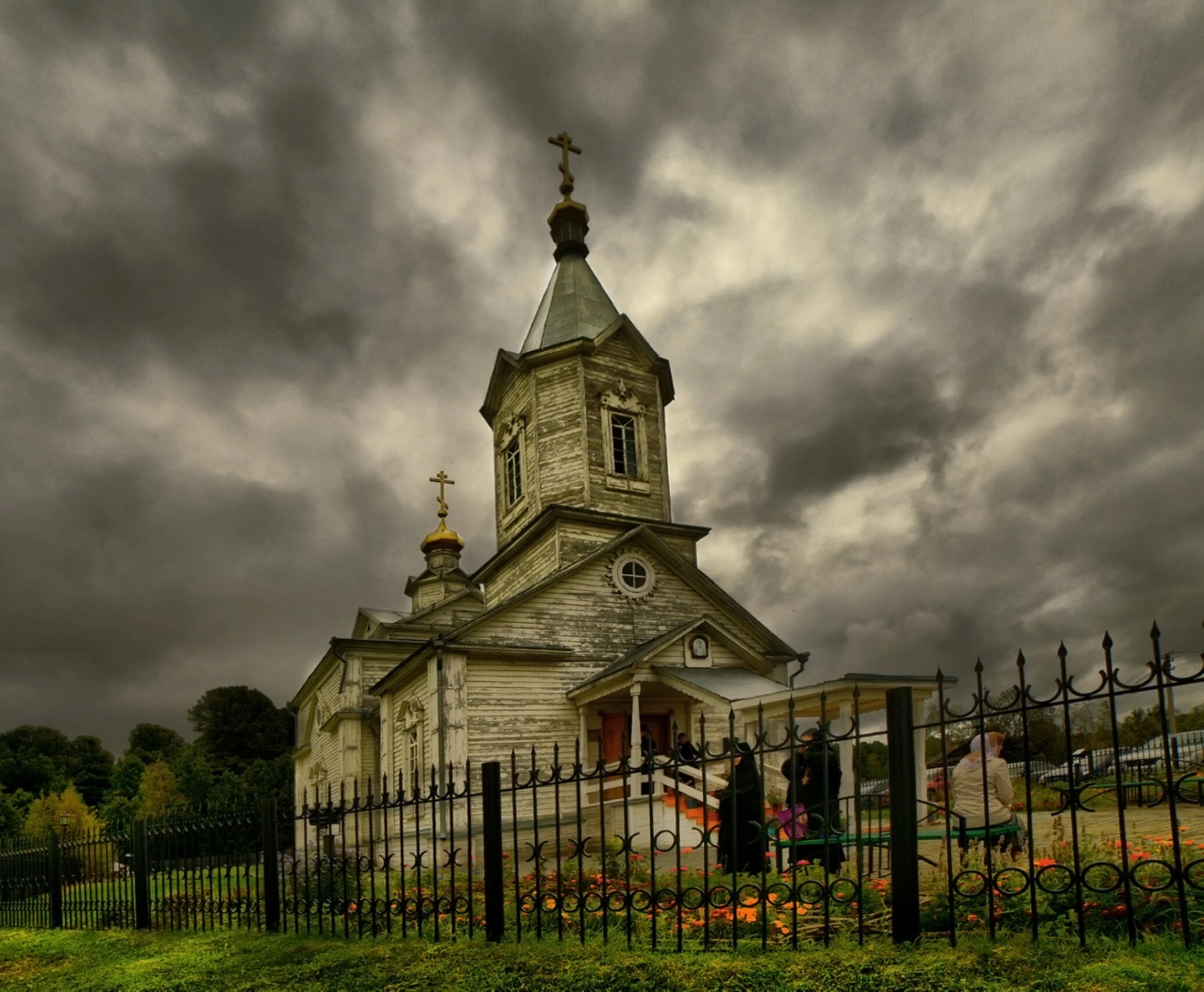 Перед храмом виднеется ажурный кованый забор, за которым ухоженная территория с цветниками, где преобладают красные и оранжевые цветы, создающие яркий контраст с суровой природой региона. На снимке присутствуют прихожане, что свидетельствует о действующем статусе храма и его значении для местной православной общины.