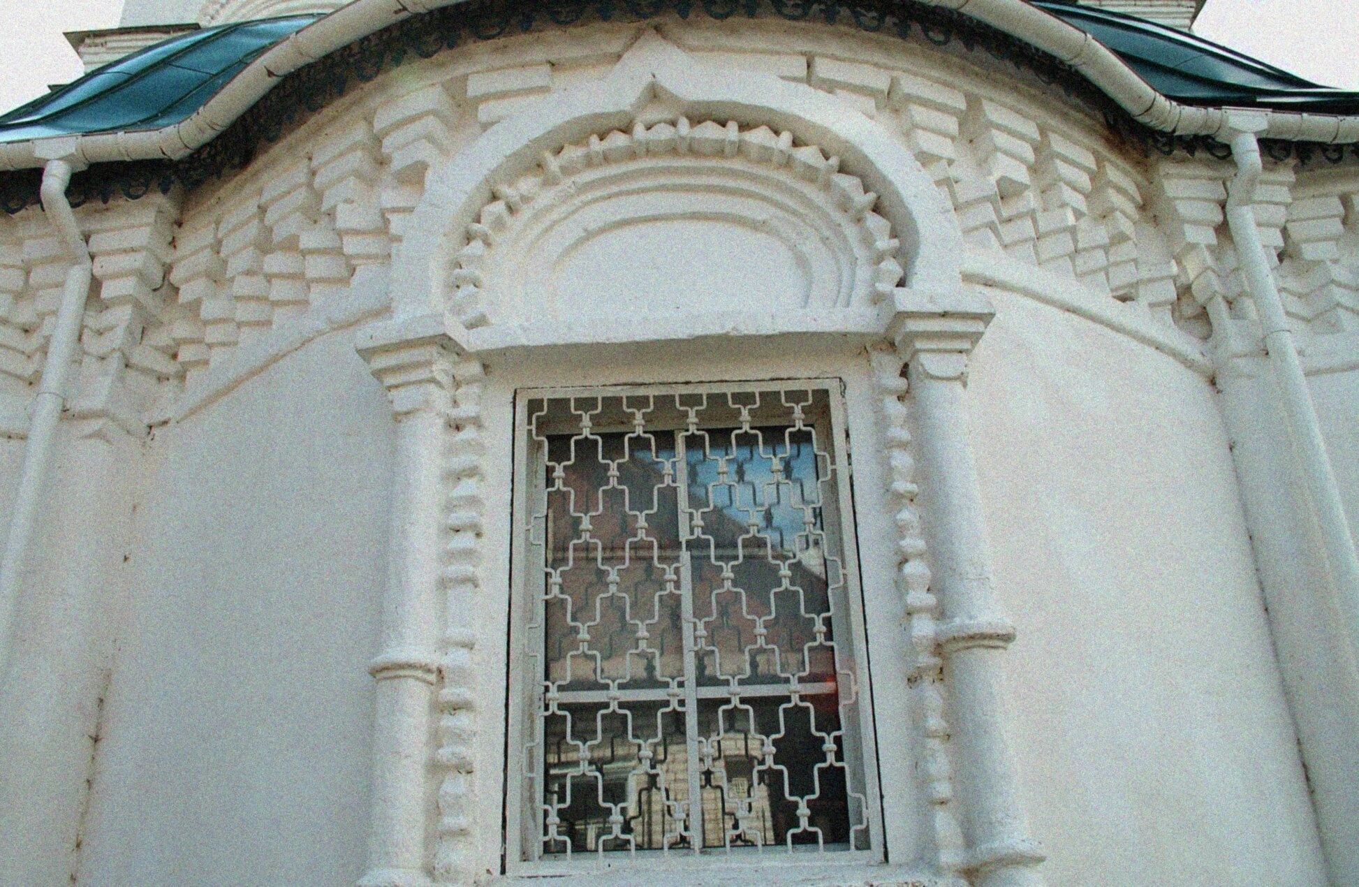 На представленной фотографии запечатлен уникальный фрагмент стены старинного православного храма — Церкви Чуда Архистратига Михаила в Городце. В центре композиции находится оконный проем, обрамленный величественным наличником с килевидным завершением, характерным для древнерусского церковного зодчества. По бокам окно фланкируют колонки, придающие композиции строгость и устремленность ввысь, к горнему миру.