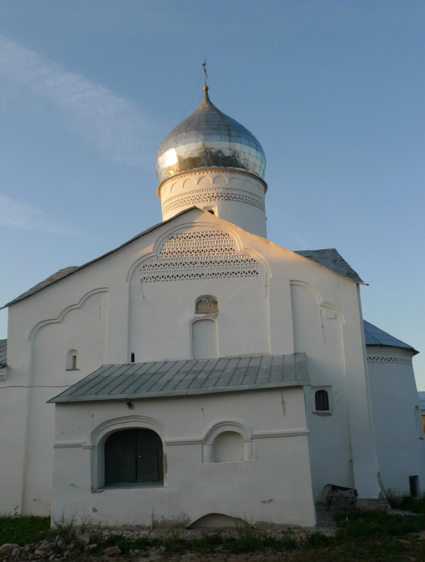 Архитектурный облик храма, который мы видим на снимке, сложился в основном durante перестройки 1462-1463 годов, когда здание приобрело свой характерный внешний вид. Фотография позволяет рассмотреть характерные черты новгородской храмовой архитектуры: мощный основной объём, увенчанный шлемовидным куполом, который покрыт блестящим металлическим материалом и увенчан православным крестом. Барабан купола украшен декоративным аркатурно-колончатым поясом, что является традиционным элементом церковного зодчества древнего Новгорода.