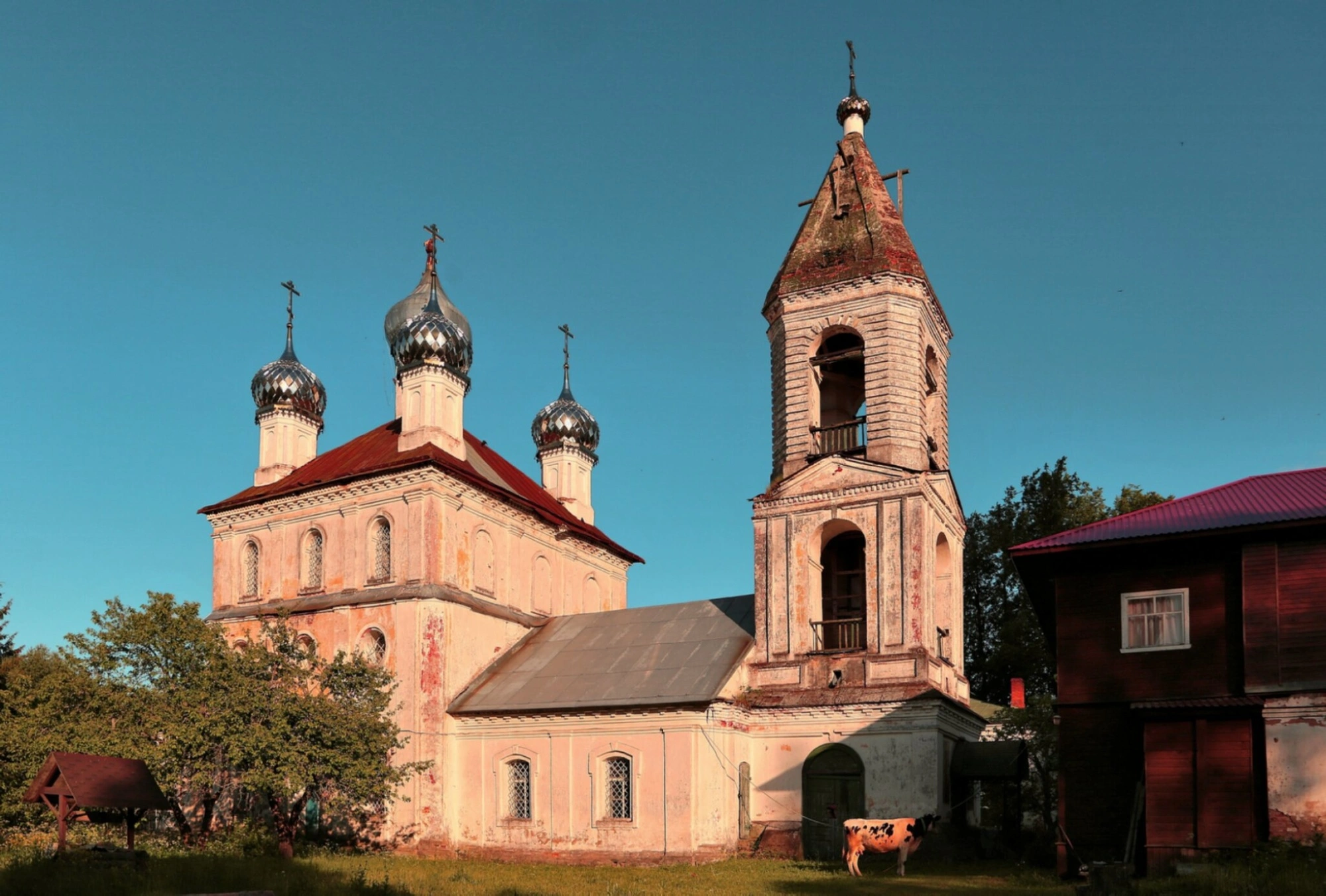 На переднем плане фотографии видна мирно пасущаяся корова, что подчеркивает сельский характер местности и гармоничное соседство храма с окружающей природой. Рядом с церковью просматривается деревянное строение, вероятно, относящееся к церковному хозяйству. Храм находится в живописной местности Владимирской земли, известной своими православными традициями и богатым историческим наследием.