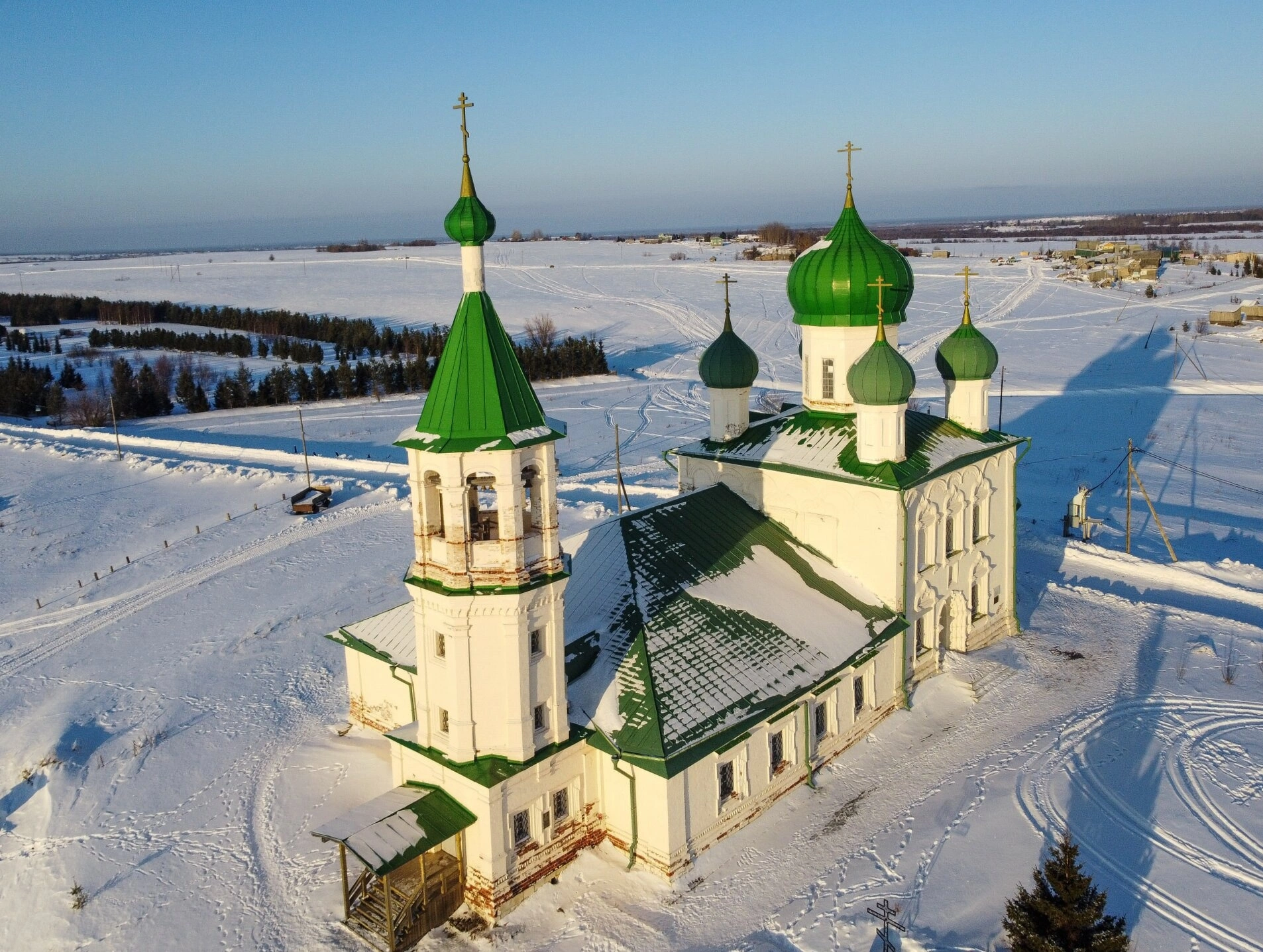 На представленной фотографии запечатлен храм в честь святого великомученика Димитрия Солунского, расположенный в селе Ломоносово Холмогорского района Архангельской области. Снимок выполнен с высоты птичьего полета в ясный зимний день, что позволяет в полной мере оценить архитектурное совершенство православной святыни.