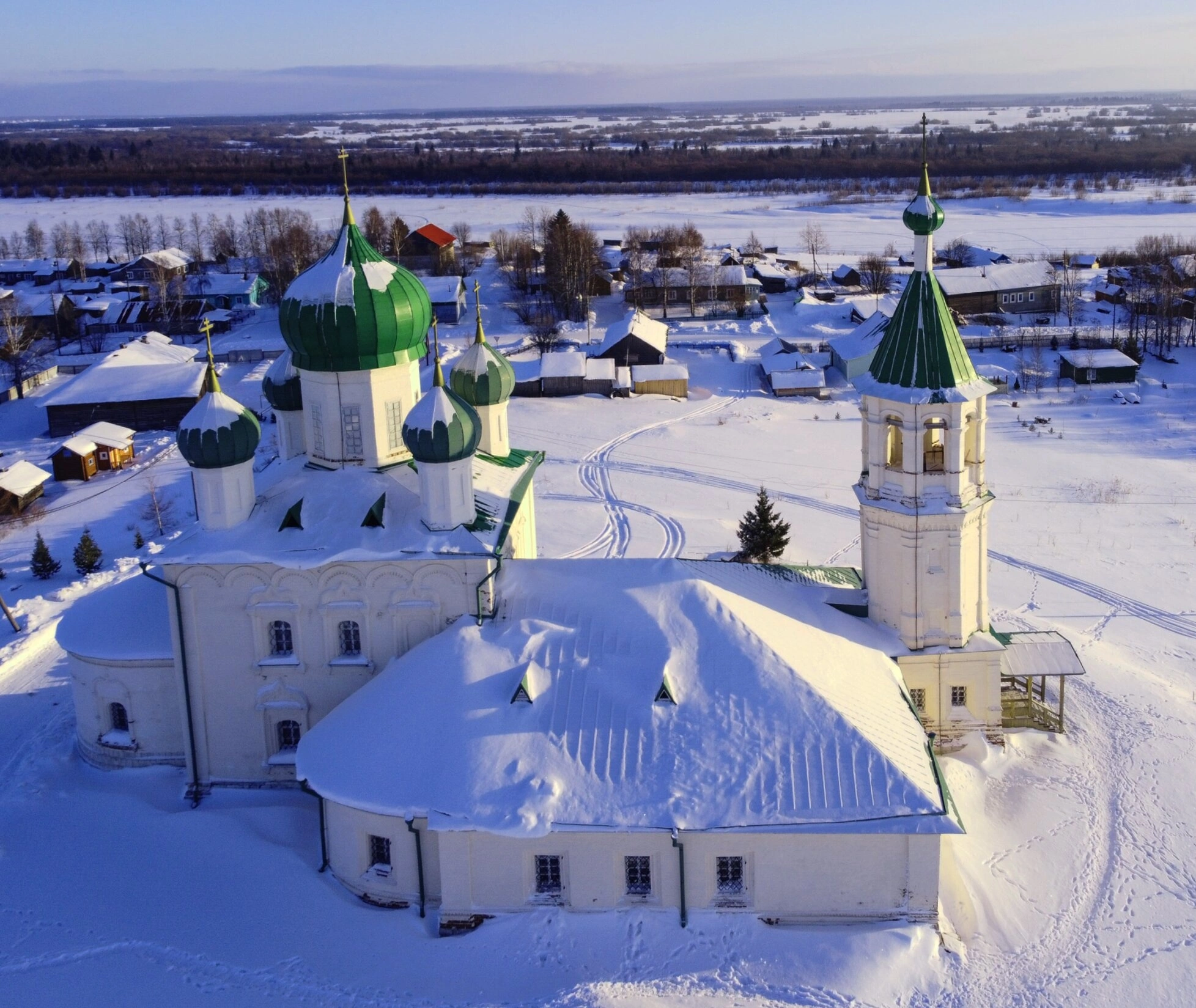 На представленной фотографии запечатлен архитектурный ансамбль церкви Димитрия Солунского, расположенной в селе Ломоносово Холмогорского района Архангельской области. Снимок выполнен с высоты птичьего полета в зимний период, что позволяет в полной мере оценить величие православной святыни и её гармоничное единение с окружающим природным ландшафтом.