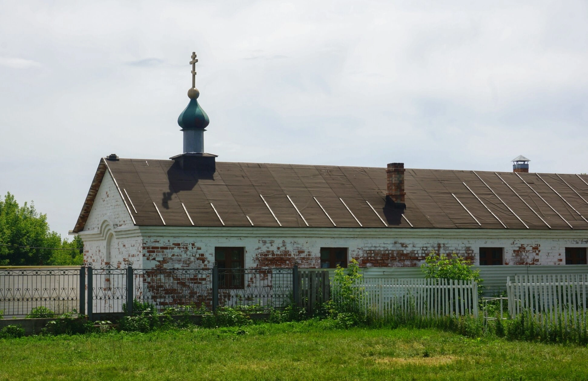 На представленной фотографии запечатлён храм во имя святого великомученика Димитрия Солунского, расположенный в селе Лопатино. Это одноэтажное каменное здание, увенчанное традиционным куполом, на котором установлен православный крест, сияющий в поднебесье. Фасад церкви отличается строгостью и лаконичностью форм, что характерно для храмового зодчества данного периода.