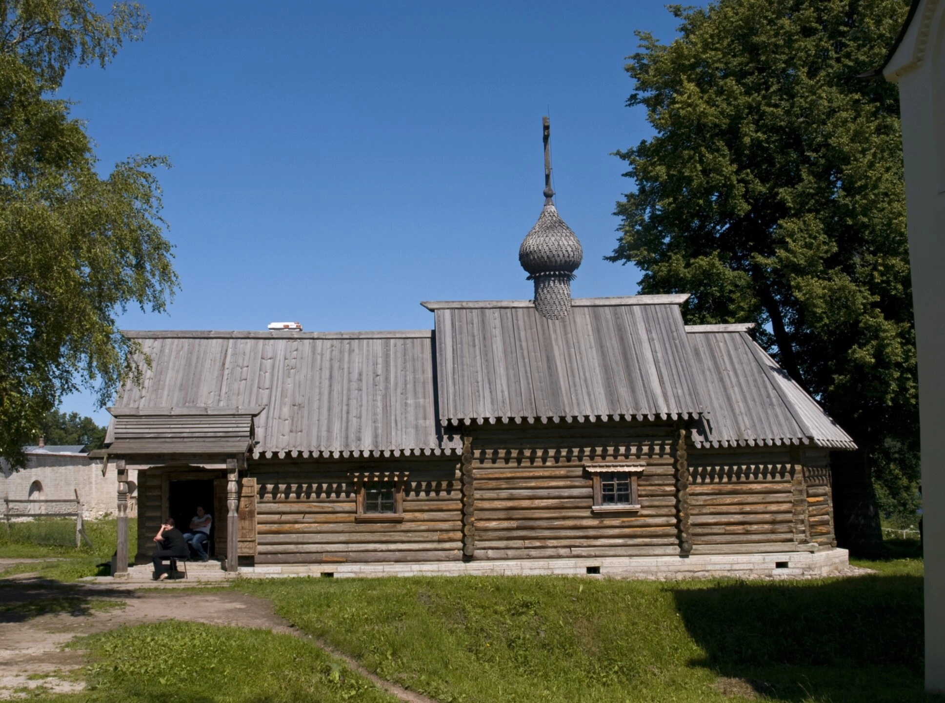 С левой стороны к основному объему храма пристроено крыльцо с защитным навесом, где на скамье располагаются две фигуры людей. Древесина стен и кровли сохраняет естественную текстуру и показывает благородные следы времени, свидетельствующие о исторической ценности сооружения.