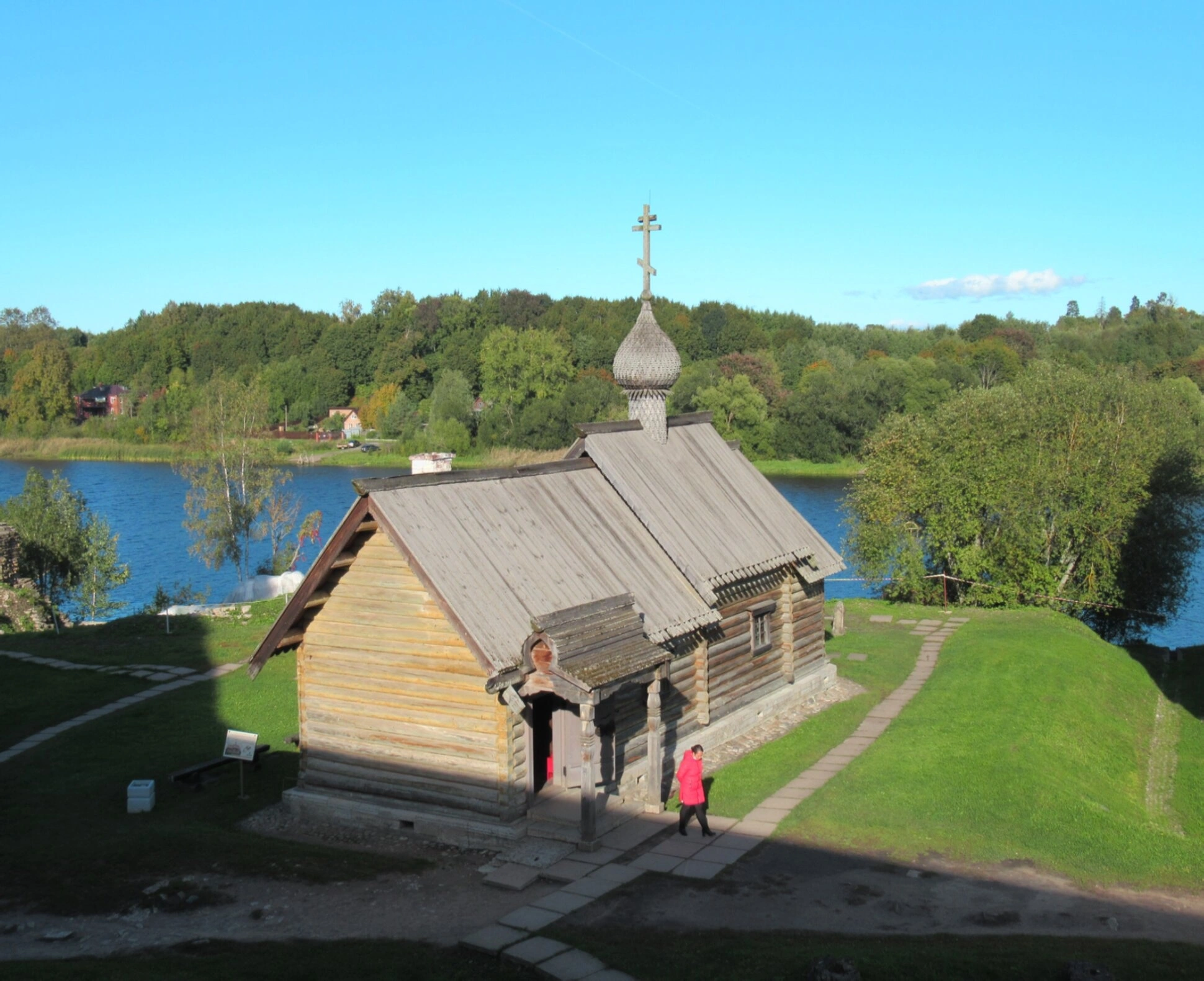 Храм располагается на живописном зеленом холме, к его входу ведет аккуратно вымощенная дорожка. На заднем плане открывается величественная панорама реки Волхов и густых лесов, окрашенных в золотистые осенние тона. Чистое голубое небо над церковью создает ощущение благодати и духовной чистоты этого места.