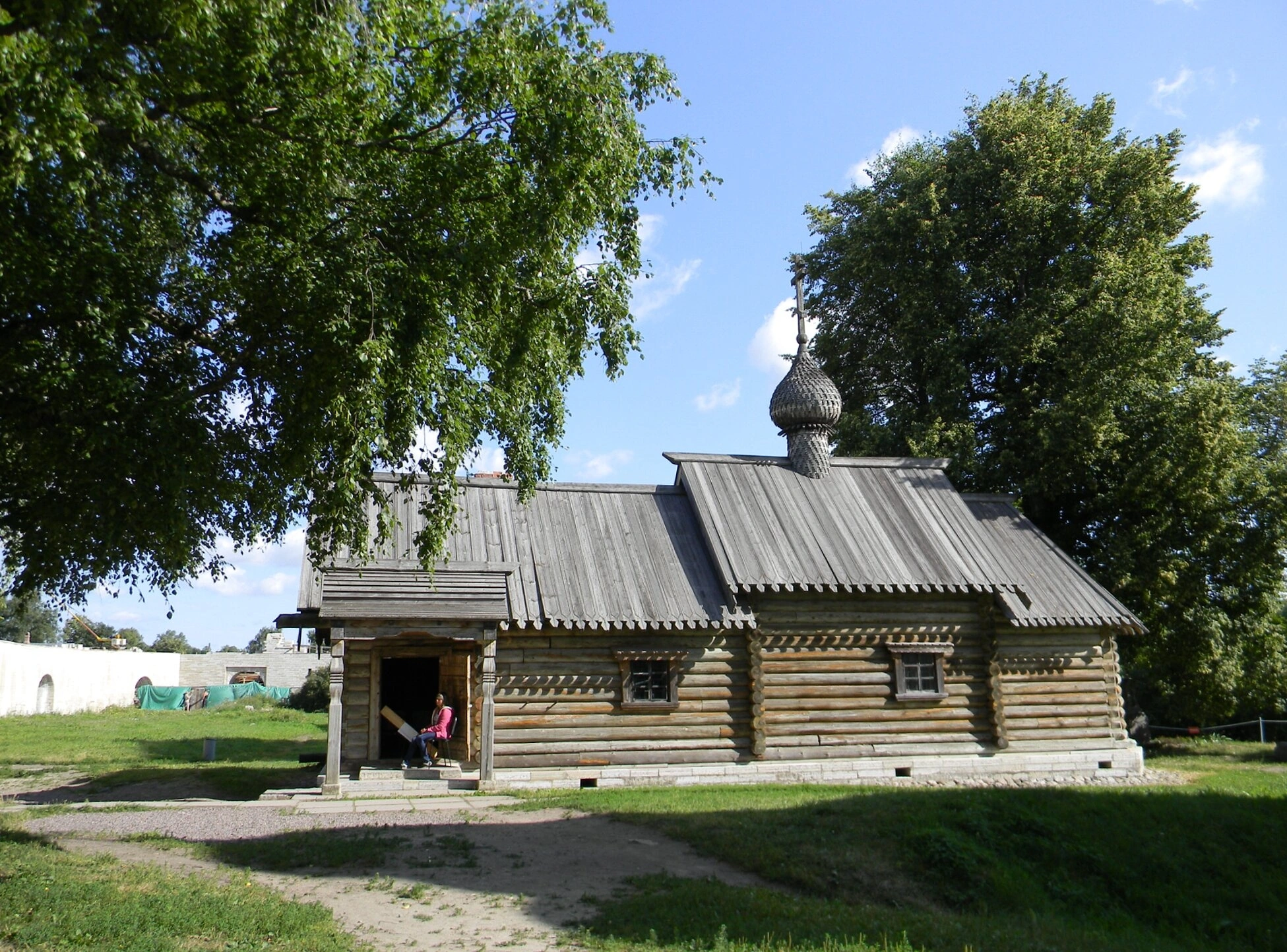 На представленной фотографии запечатлена деревянная церковь во имя святого великомученика Димитрия Солунского, расположенная на территории Староладожской крепости. Этот уникальный памятник русского православного зодчества является объектом культурного наследия и находится под охраной государства.