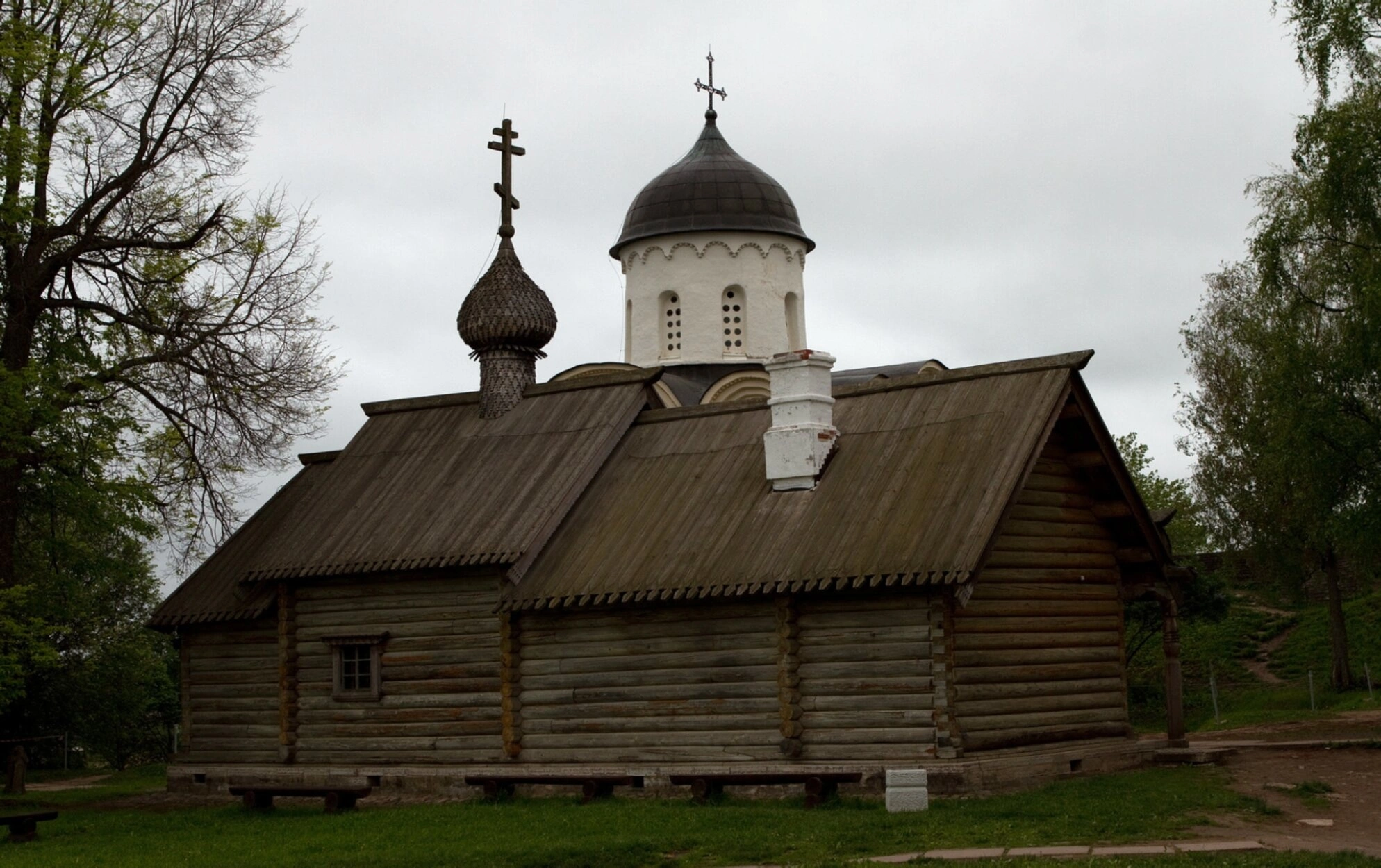 Храм окружает живописный природный ландшафт: деревья с редкой листвой, характерной для межсезонья, и деревянные скамьи перед входом создают атмосферу умиротворения и молитвенного сосредоточения. На заднем плане просматривается склон холма, что подчёркивает удачное расположение церкви на возвышенности. Пасмурное небо с рассеянным светом придаёт снимку особую лиричность и духовную глубину.