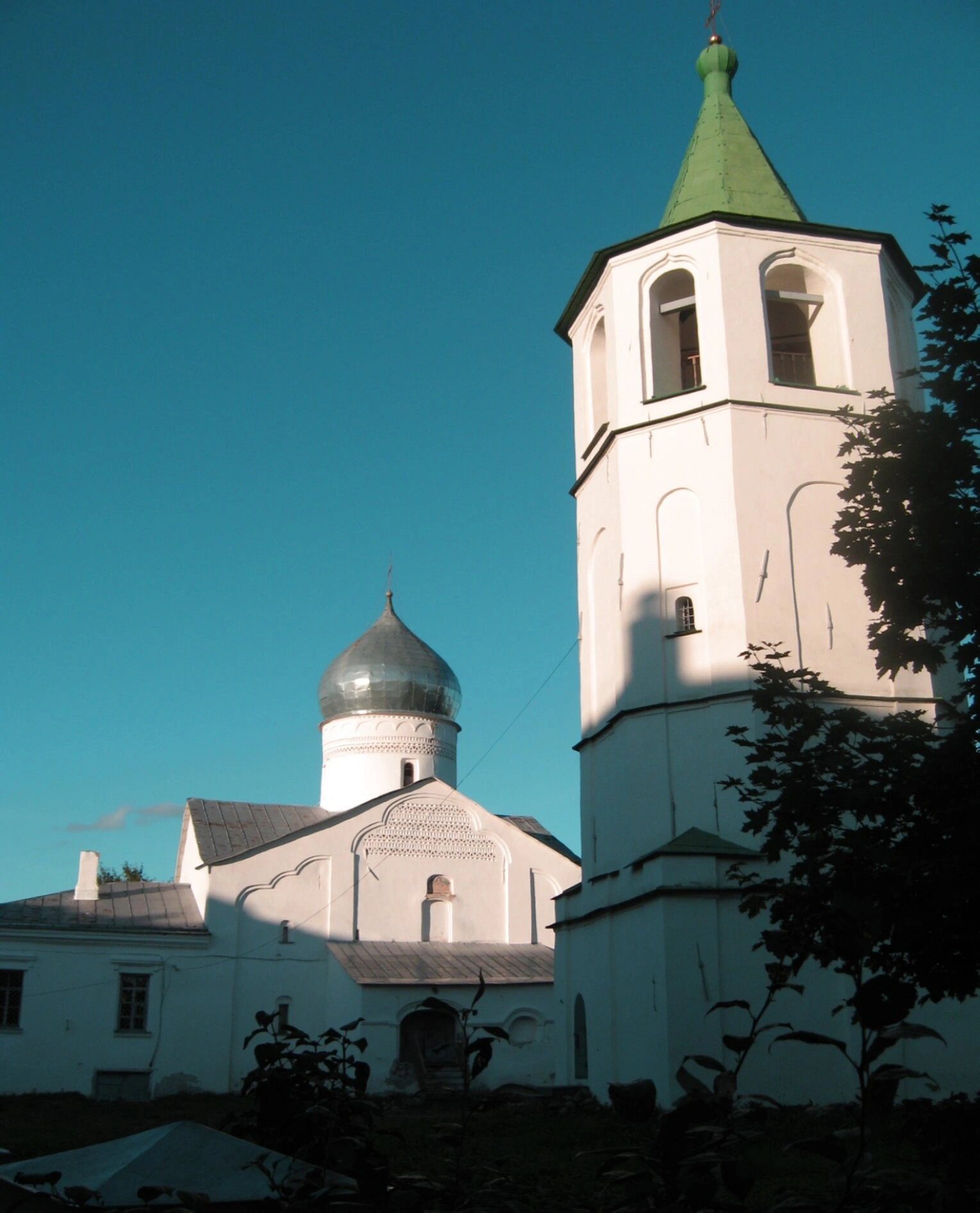 На представленной фотографии запечатлён архитектурный ансамбль на историческом Ярославовом Дворище в Великом Новгороде. В центре композиции находится белоснежная церковь во имя святого великомученика Димитрия Солунского, увенчанная серебристым куполом, который символизирует небесную славу и чистоту православной веры. Справа от храма возвышается стройная колокольня с зелёным шатром, являющаяся неотъемлемой частью священного пространства и призывающая верующих на молитву своим благозвучным звоном.