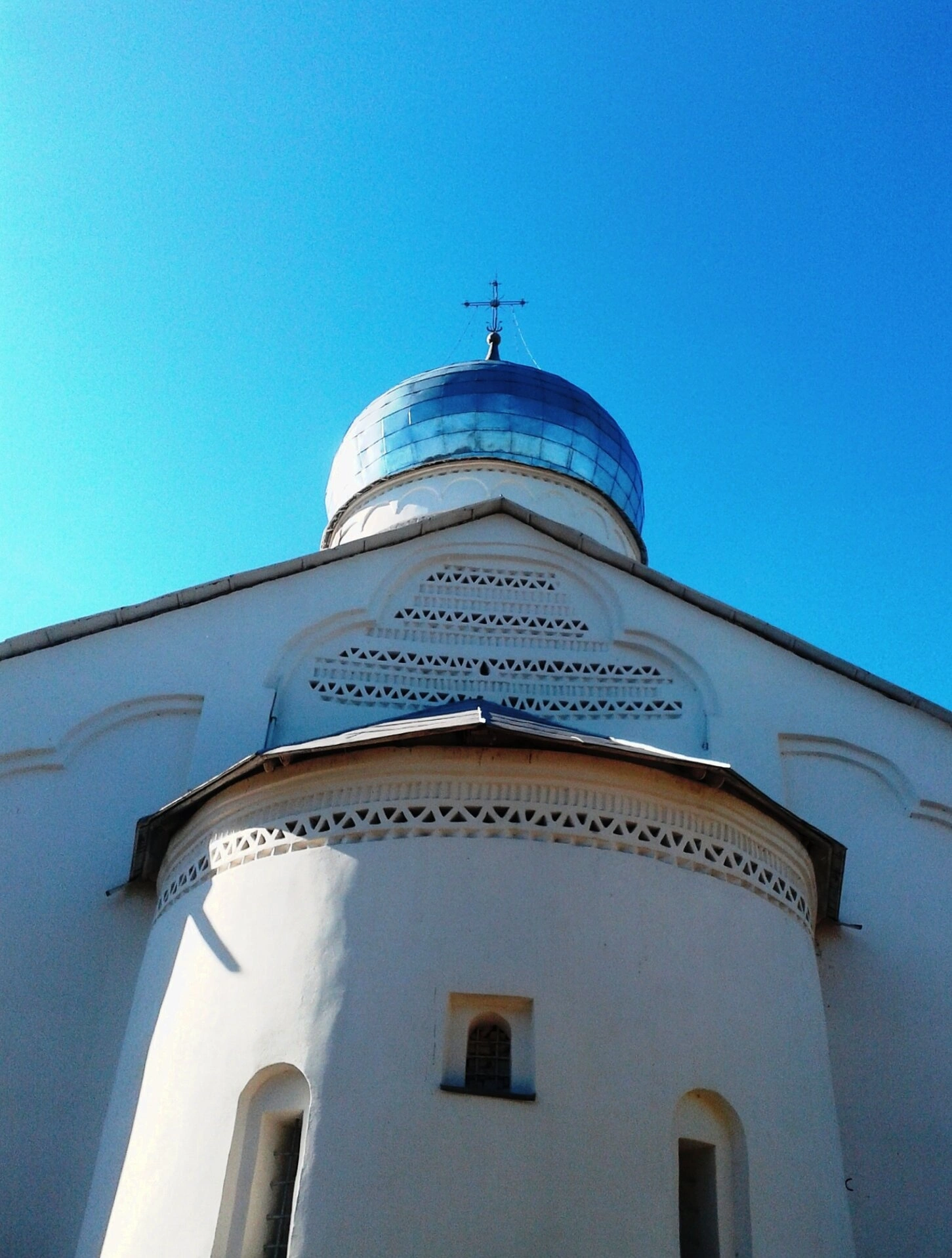 На снимке прекрасно виден белокаменный фасад церкви, характерный для древнерусской строительной традиции. Фасад украшен изящными декоративными элементами: рядами треугольных и арочных ниш, а также поребриком, которые создают неповторимый ритмический рисунок и подчёркивают монументальность сооружения. В нижнем ярусе расположены арочные оконные проёмы, типичные для храмового зодчества того периода.