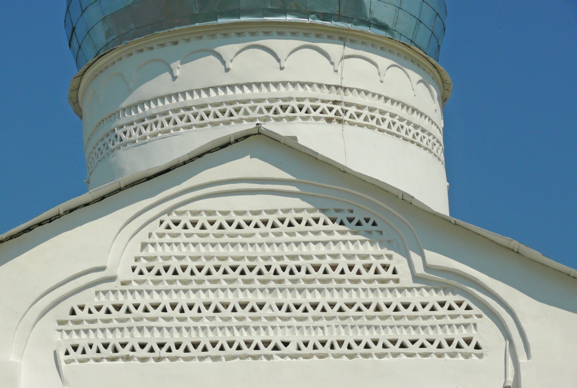 Верхняя часть снимка демонстрирует барабан главы храма, украшенный изысканным орнаментом, известным как поребрик. Этот декоративный элемент представляет собой ряд кирпичей, уложенных под углом к поверхности стены, образуя своеобразный зубчатый пояс, придающий сооружению лёгкость и устремлённость ввысь.