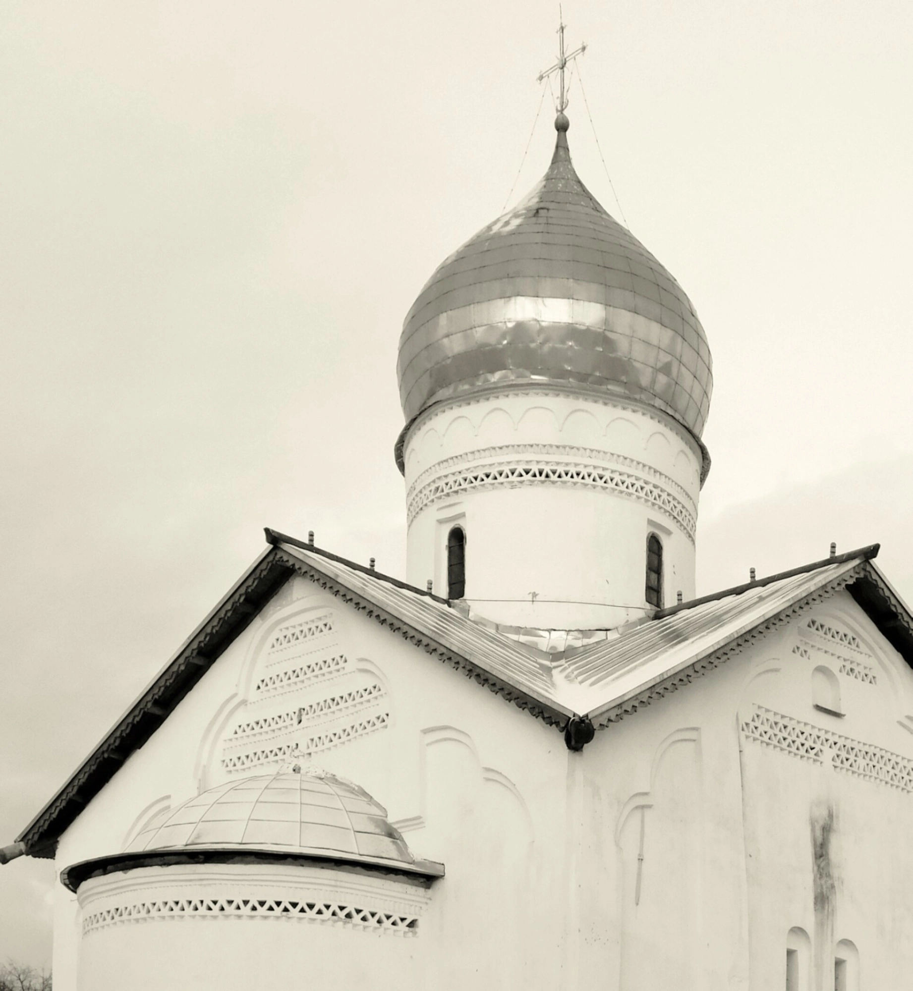 Чёрно-белое изображение подчёркивает монументальность и лаконичную красоту архитектурных форм, характерных для новгородской строительной школы. Строгий кубический объём храма, увенчанный единственным шлемовидным куполом, демонстрирует традиционную для того периода крестово-купольную систему. Фасады церкви, разделённые лопатками, завершаются характерными полукруглыми закомарами, в которых угадываются следы древней фресковой росписи.