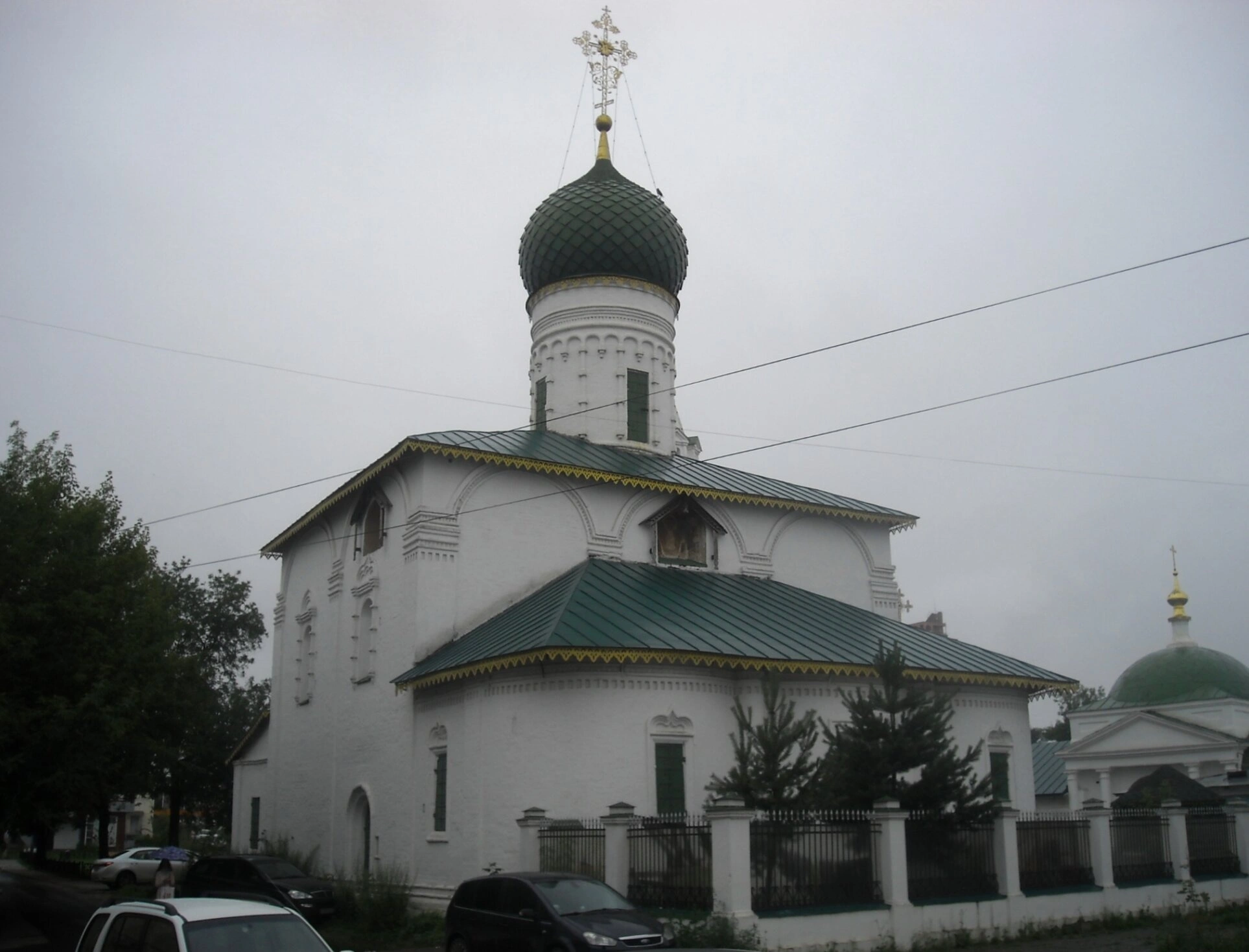 На переднем плане фотографии видны кроны деревьев и элементы чугунной ограды, что подчёркивает ухоженность и благочиние территории вокруг святого места. Припаркованные неподалёку автомобили напоминают о том, что древний храм находится в самом сердце живого, современного города, оставаясь его неотъемлемой духовной святыней.