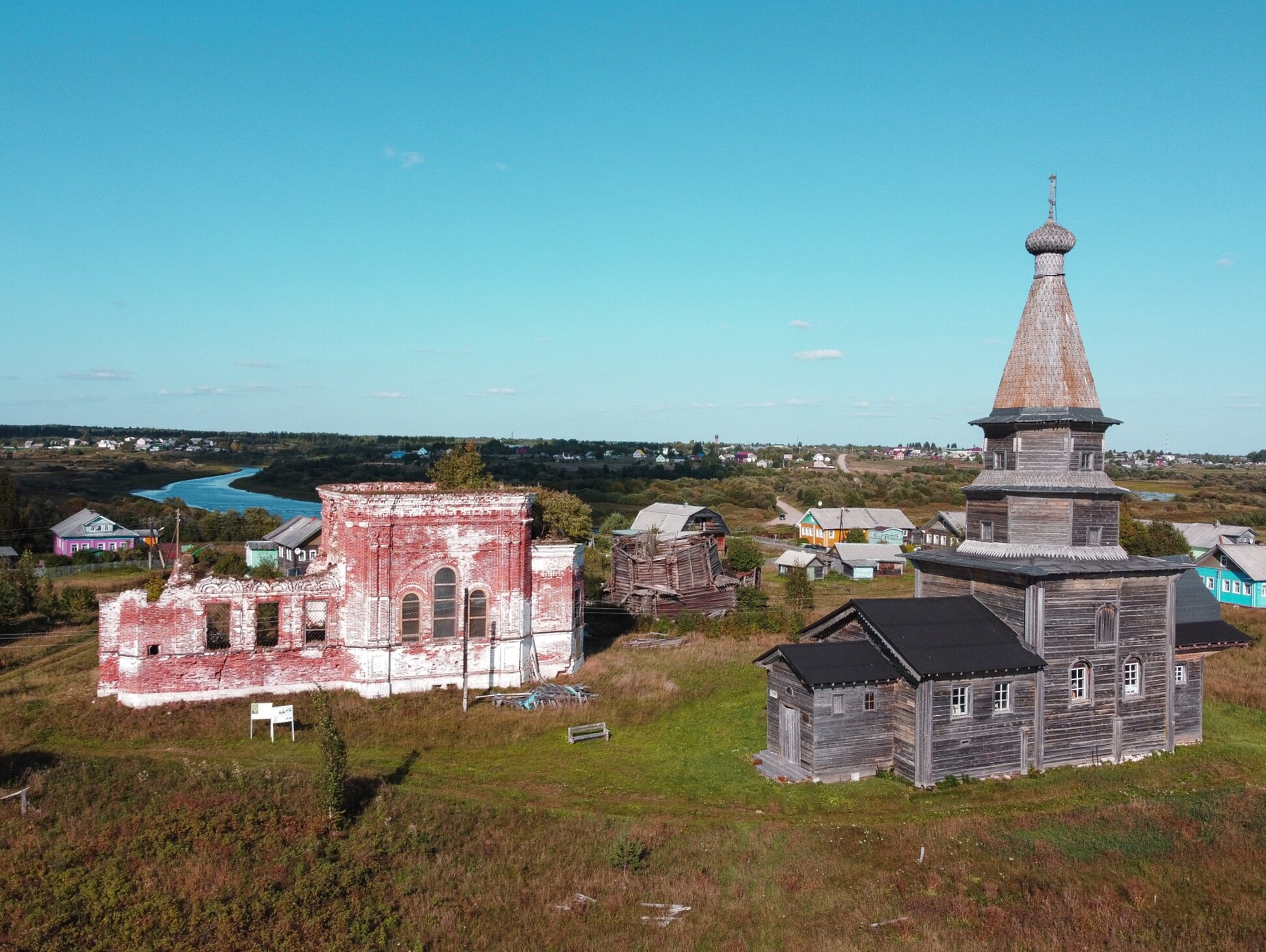 Оба храма расположены на живописном холме, поросшем травой, что создаёт особую атмосферу духовного единения с природой. На заднем плане открывается вид на извилистую реку и деревенские дома, окрашенные в разные цвета, характерные для северных поселений. Ясное голубое небо с лёгкими облаками придаёт снимку особую светозарность и подчёркивает сакральность момента.