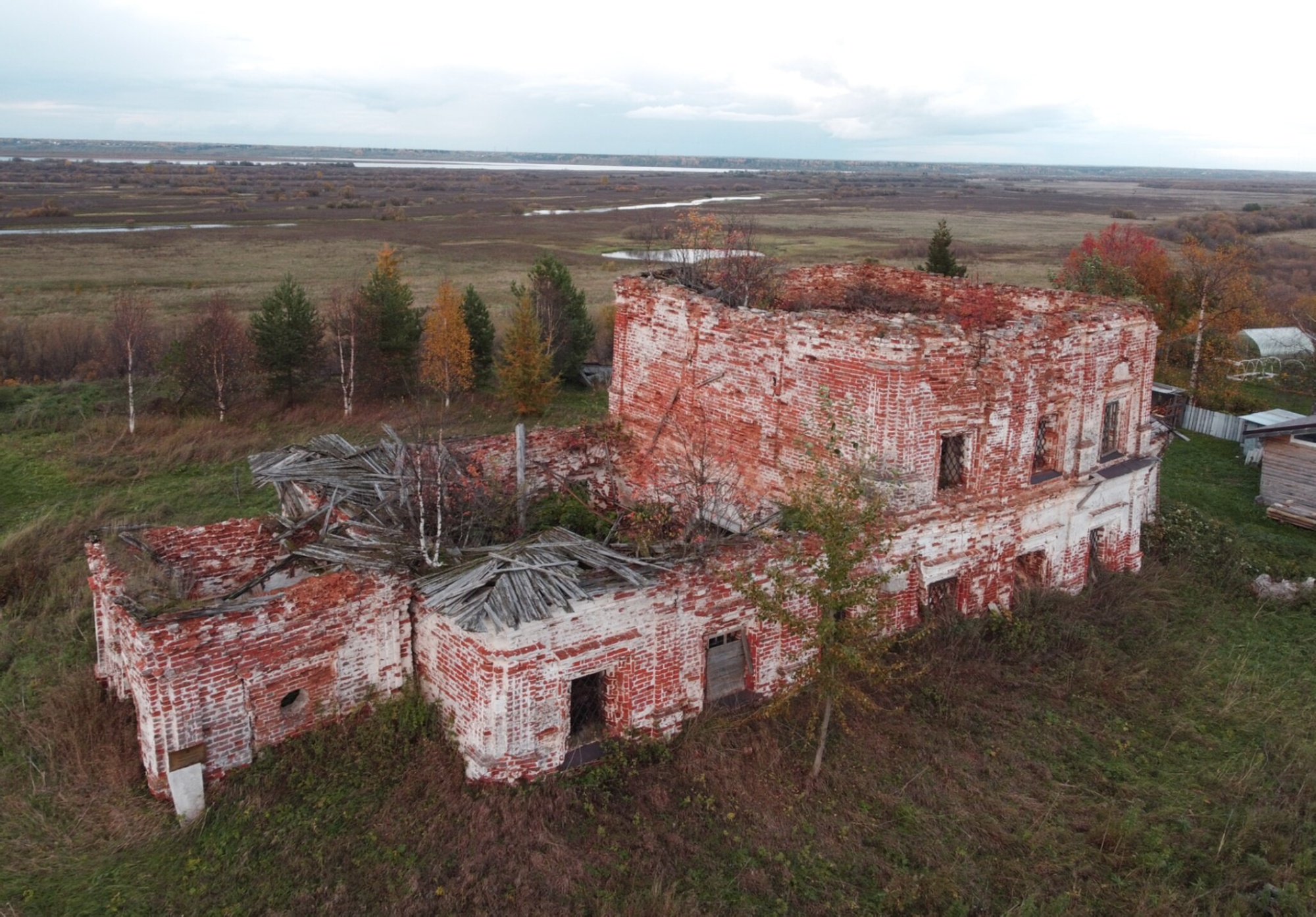 Церковное здание, сложенное из добротного кирпича, утратило кровлю и межэтажные перекрытия, стены частично обрушились под воздействием времени и непогоды. На кирпичной кладке, местами осыпавшейся, явственно проступают следы многовекового мха, свидетельствующего о долгих годах забвения. Внутри и снаружи храмовых стен произрастает дикая растительность, включая молодые деревца и кустарники, чьи корни постепенно разрушают оставшуюся кладку.
