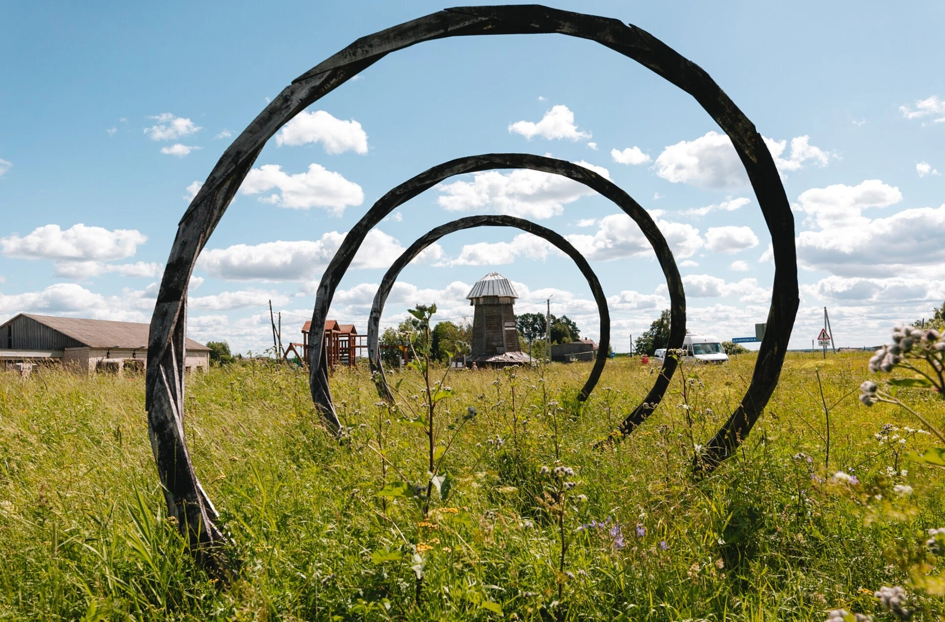 На переднем плане фотографии видны три деревянных кольца, составляющие художественную инсталляцию, которая органично вписана в ландшафт музейной территории. Эти элементы современного искусства не нарушают sacralльную атмосферу места, а напротив, подчеркивают timelessность духовных ценностей, которые воплощает в себе православный храм.