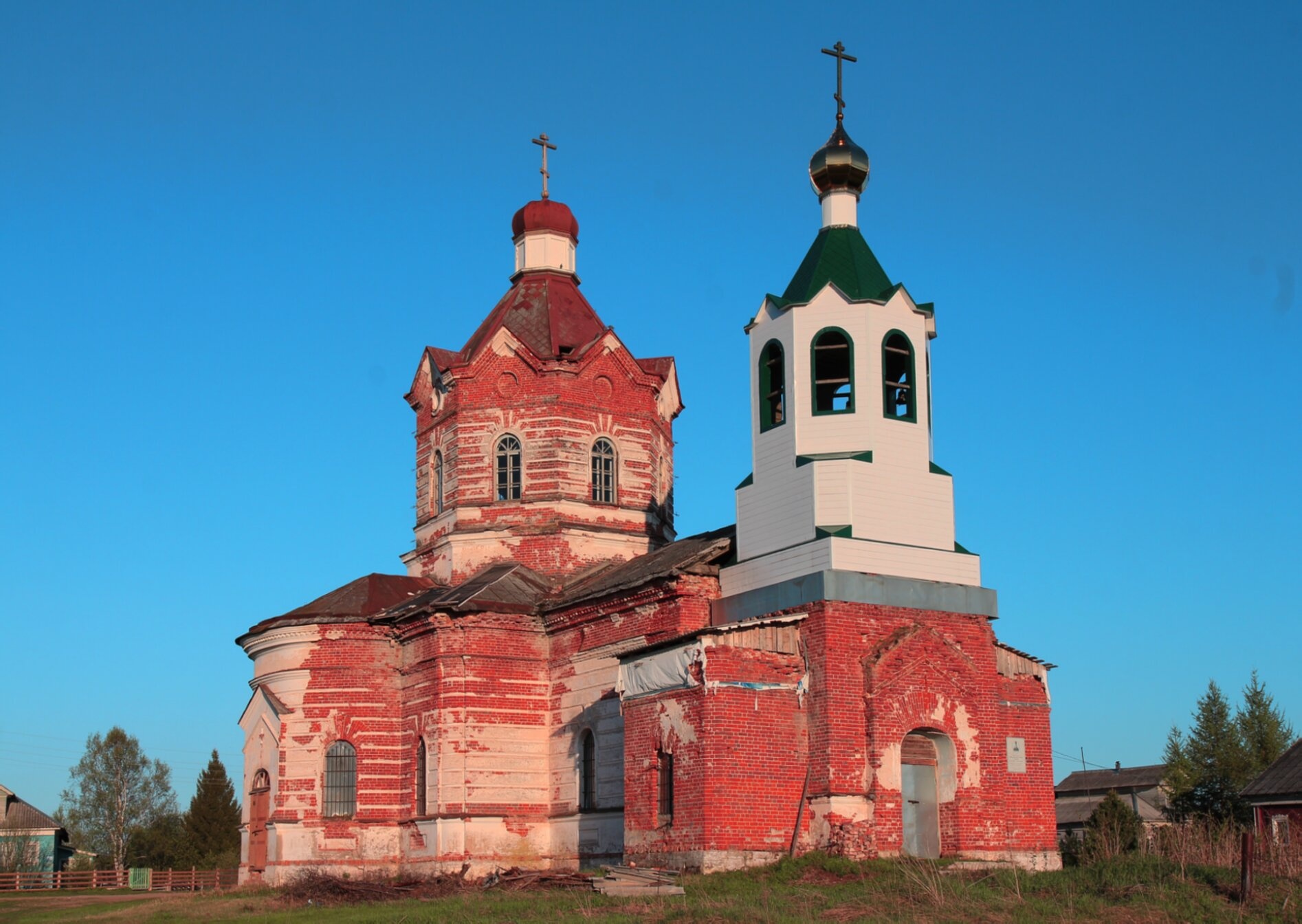 При внимательном рассмотрении фотографии отмечается, что святыня пребывает в состоянии частичного разрушения. На фасаде видны следы обветшания и повреждения кирпичной кладки, купола и кровля значительно повреждены временем. Однако на колокольне заметны следы недавних ремонтных работ - установлены новая крыша и главка, что вселяет надежду на возможное восстановление всего храмового комплекса.