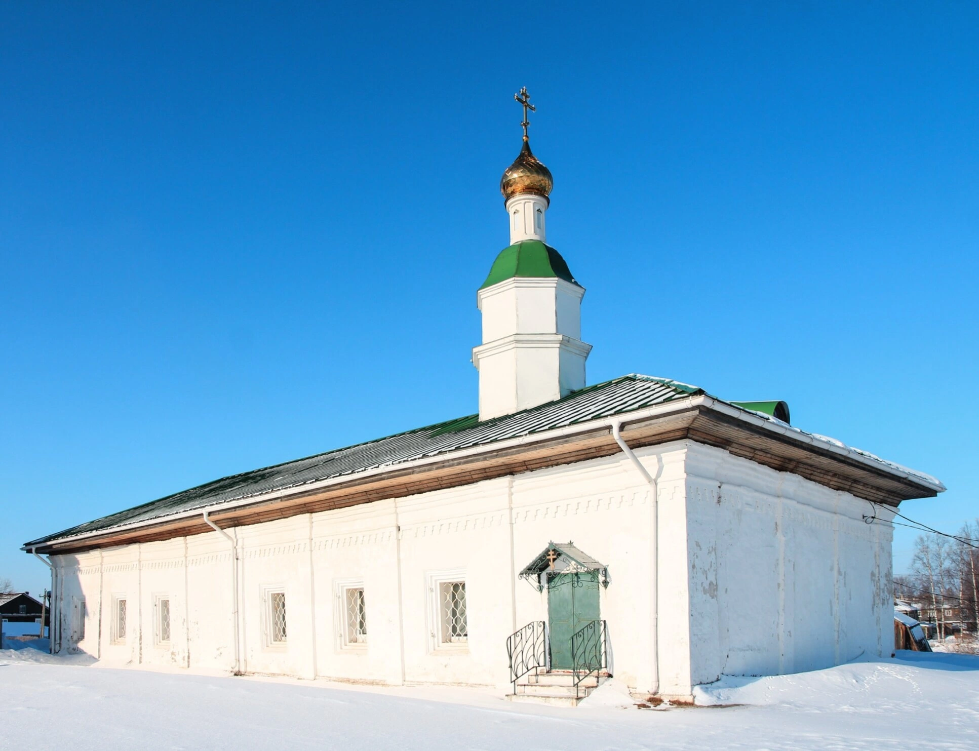 Главный вход в храм оформлен крыльцом с двускатным навесом и металлической лестницей с перилами. Дверь, окрашенная в бирюзовый цвет, добавляет яркий акцент в общий облик сооружения. Храм расположен на заснеженной территории, что свидетельствует о зимнем времени съёмки. На заднем плане просматриваются деревья и хозяйственные постройки, характерные для сельской местности.