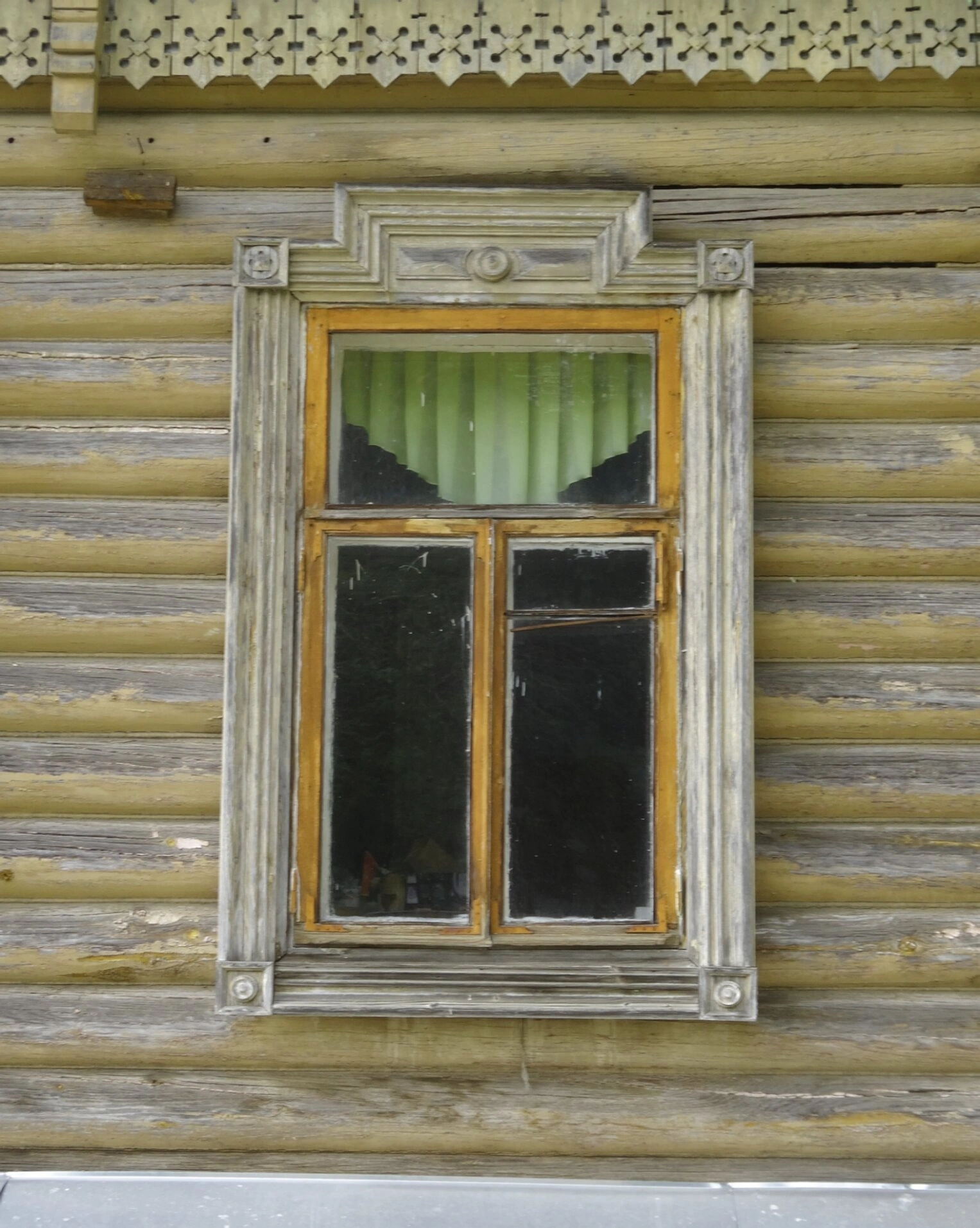 Окно разделено на несколько секций, где правая часть обладает двумя горизонтальными элементами с темными стеклами, создающими эффект отражения. Левая часть оконной конструкции позволяет разглядеть фрагмент церковного интерьера с зелеными жалюзи. Особого внимания заслуживает наличник, изготовленный из дерева и украшенный грубоватой, но выразительной резьбой, характерной для православных храмов русского севера.