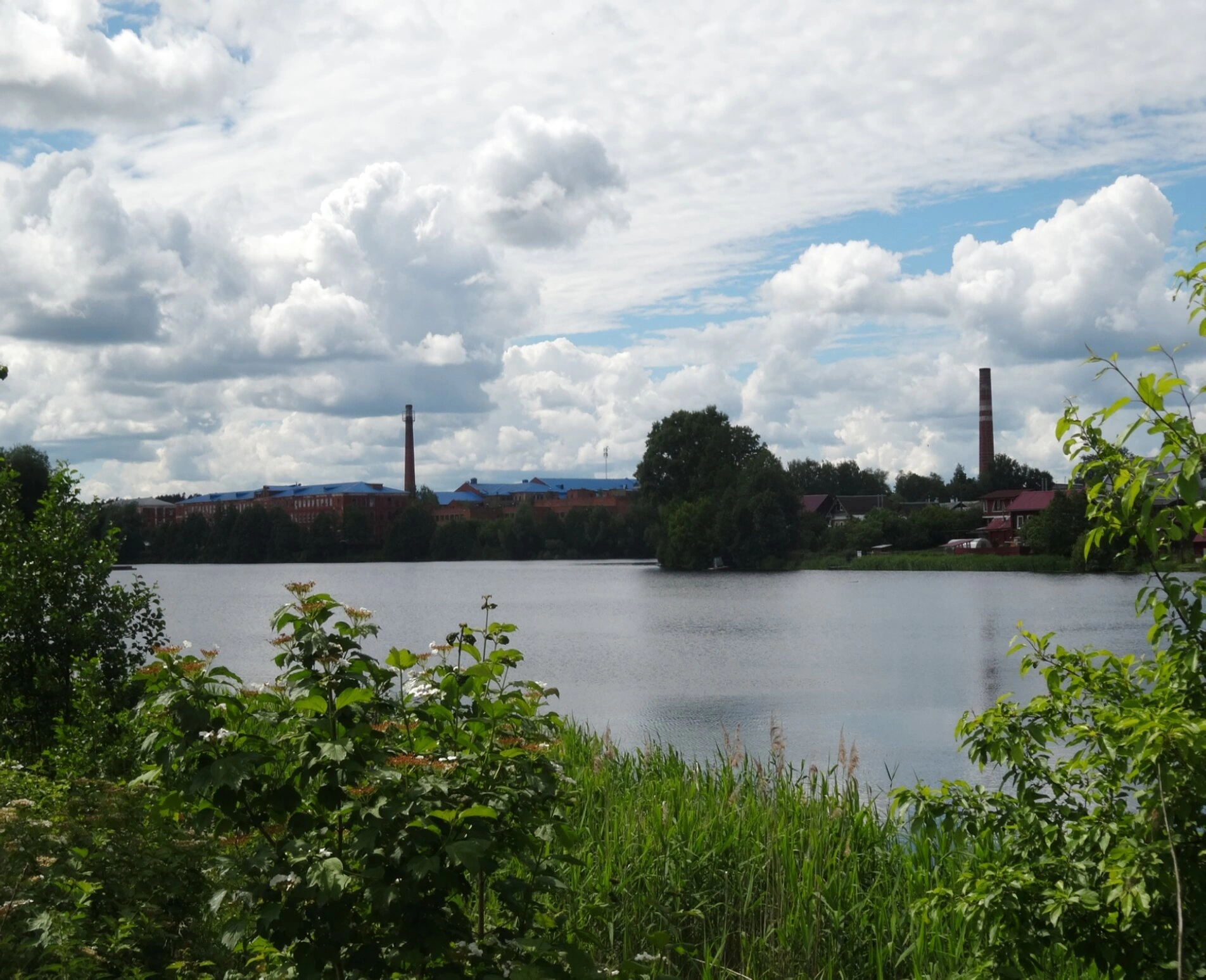 На заднем плане фотографии просматриваются промышленные сооружения, включая два высоких кирпичных дымовых трубы, являющиеся свидетельством исторического промышленного развития данной местности. Небесный свод с облачными образованиями завершает композицию снимка, создавая атмосферу русского провинциального пейзажа.