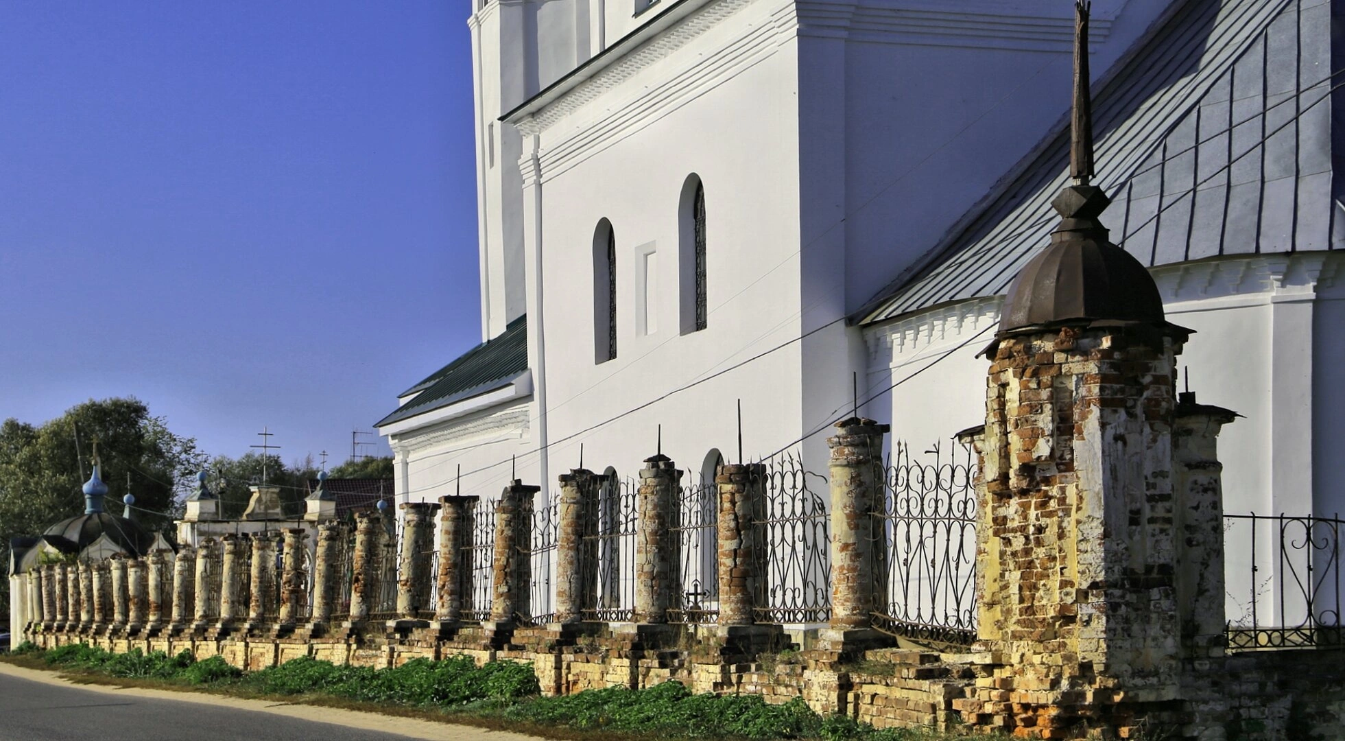 Белоснежный храм с высокими арочными окнами и голубым куполом, устремленным в небесную высь, представляет собой образец церковной архитектуры. Небесная лазурь, запечатленная на снимке, символически отражает духовную чистоту и благодать, ниспосланную этому святому месту. Ясный день, зафиксированный фотографом, подчеркивает величие православной святыни.