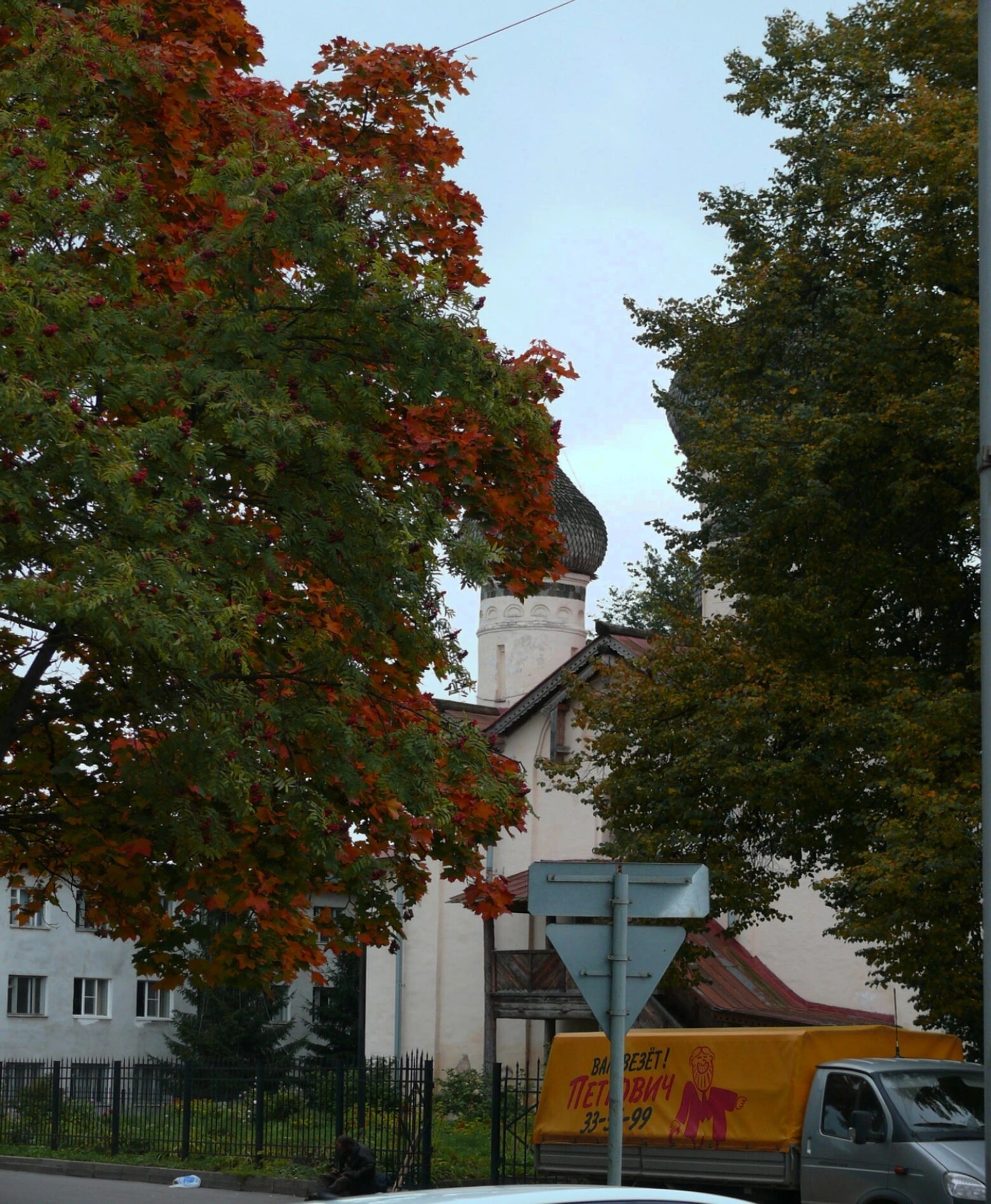 На снимке фасад белоснежного четверика храма и его характерный купол, увенчанный православным крестом, частично обрамлены ветвями деревьев, листва которых приобретает осенние багряные и золотистые оттенки. Это придаёт кадру особое настроение и ощущение единения древней святыни с природой. Слева от церкви просматривается фрагмент городской застройки, а в правой части кадра угадываются элементы городской инфраструктуры, что подчёркивает расположение храма в историческом центре города.