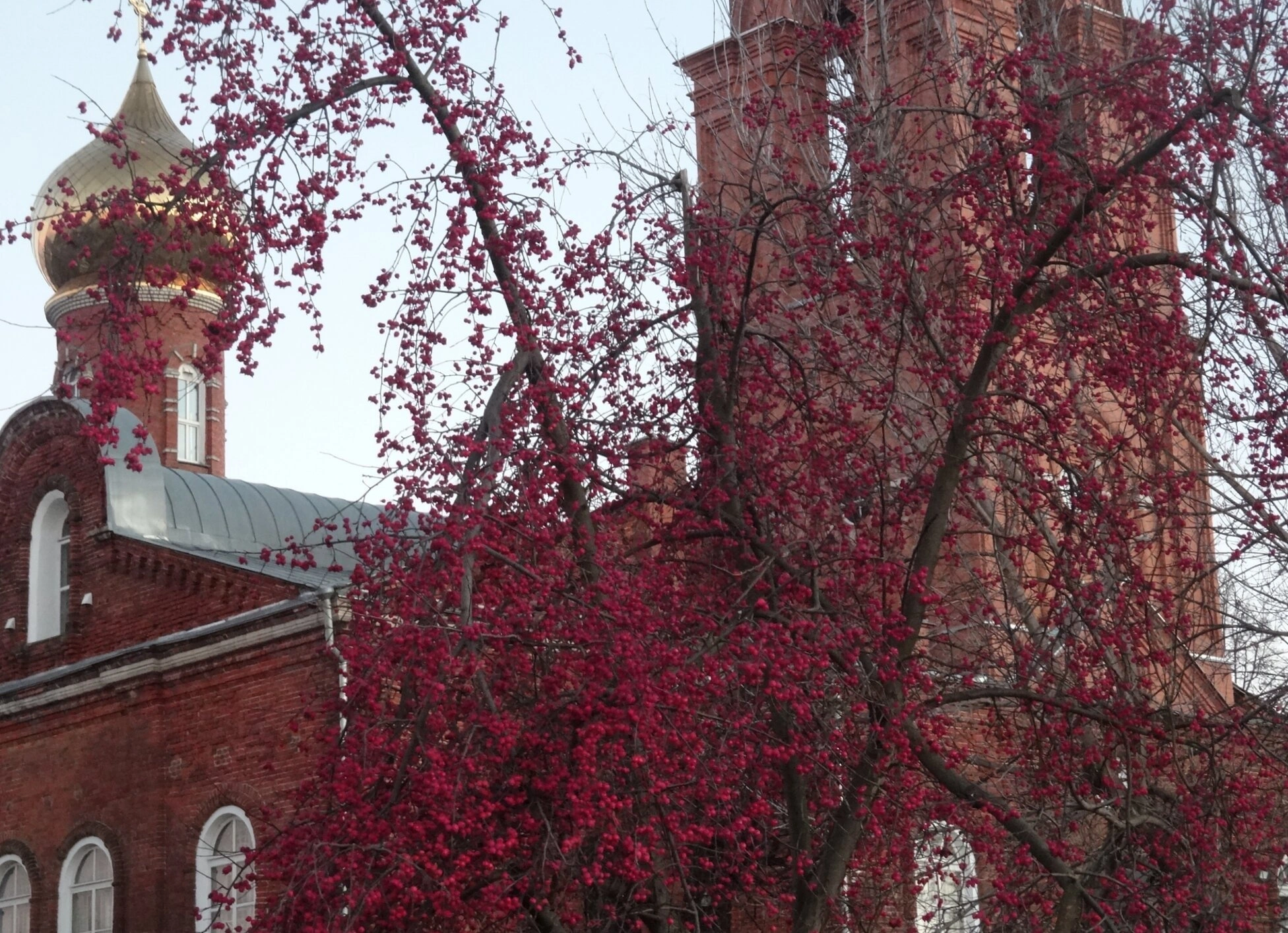 Архитектура храма представляет собой характерный образец русского церковного зодчества второй половины XIX века. Здание выполнено из красного кирпича с изящными белокаменными деталями. Фасад украшен традиционными для православных храмов арочными окнами и кокошниками. На переднем плане фотографии видно дерево с алыми плодами, вероятно, рябину, которая символически обрамляет святыню, создавая гармоничное сочетание творения Божия и рукотворного храма.