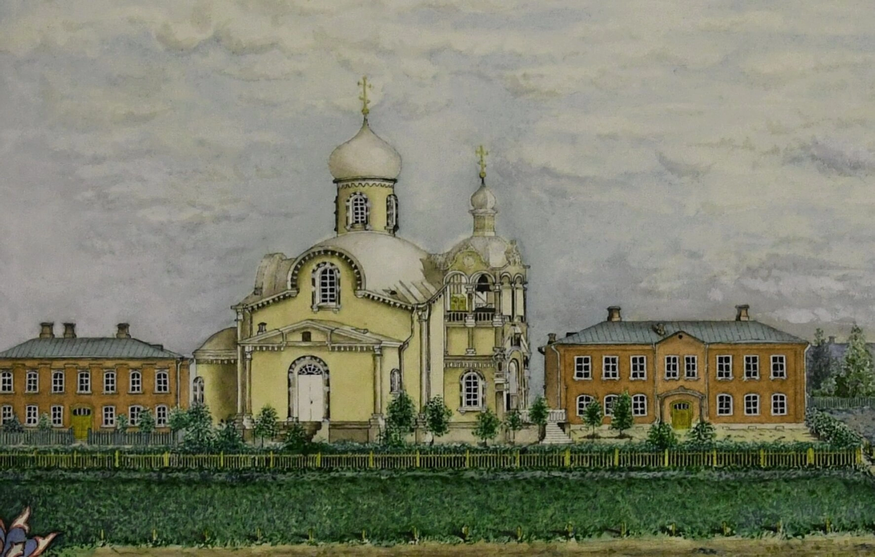 Окружающий ландшафт дополнен скромной растительностью - зеленой травой и деревьями, обрамляющими церковные строения. На заднем плане изображено пасмурное небо с облаками, создающее атмосферу духовной сосредоточенности и умиротворения, характерную для русской провинции.