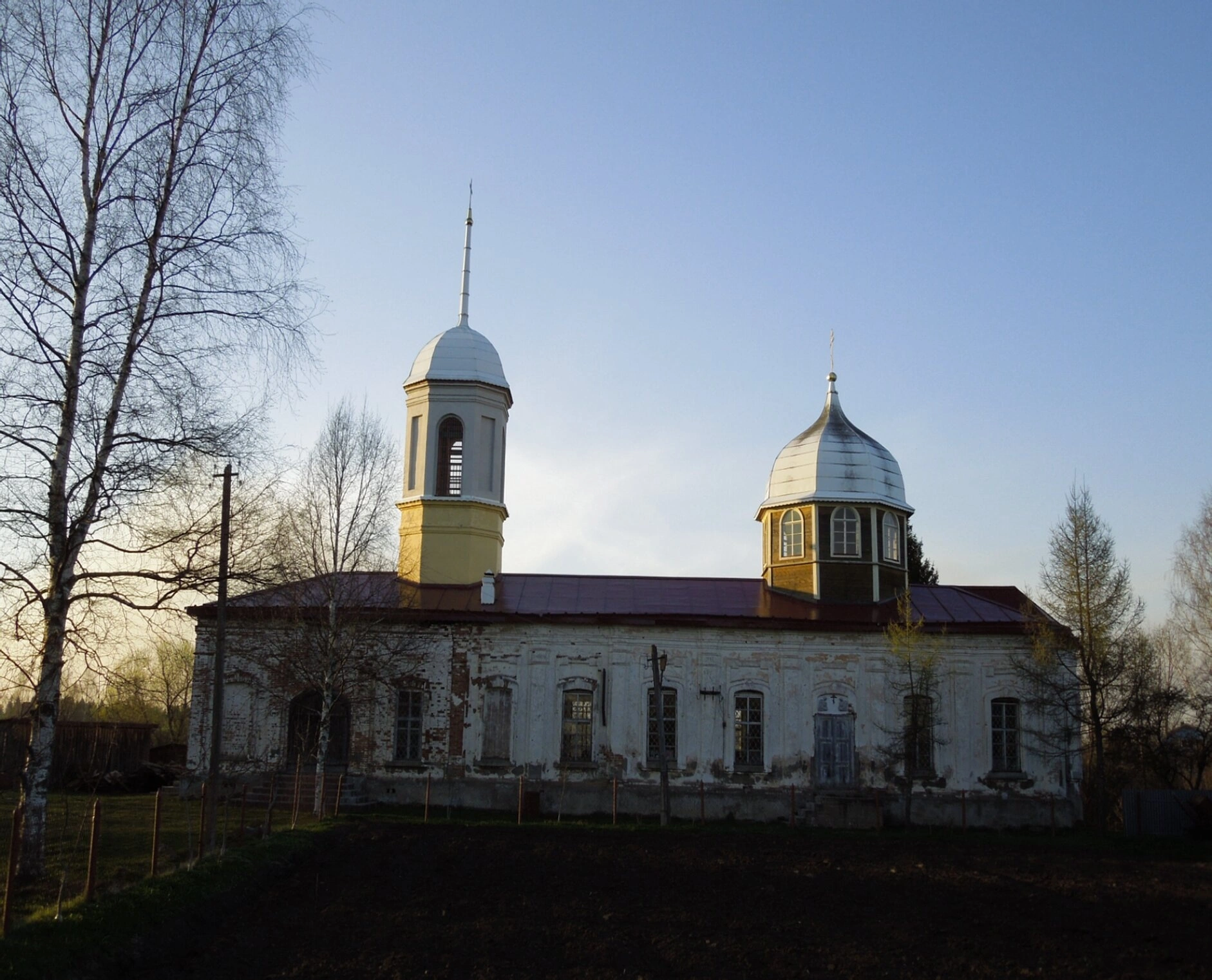 На фотографии запечатлён православный храм во имя святых мучеников Флора и Лавра в деревне Великий Порог Боровичского района Новгородской области. Каменная церковь с колокольней стоит на живописном берегу реки Мсты. Снимок сделан в час, когда солнце находится низко над горизонтом, отчего фасад здания и окружающие его голые и хвойные деревья отбрасывают длинные, мягкие тени. Металлические купола — центральный и на колокольне — поблёскивают в лучах закатного или рассветного света. Обветшалая краска и следы времени на стенах храма повествуют о его долгой истории.