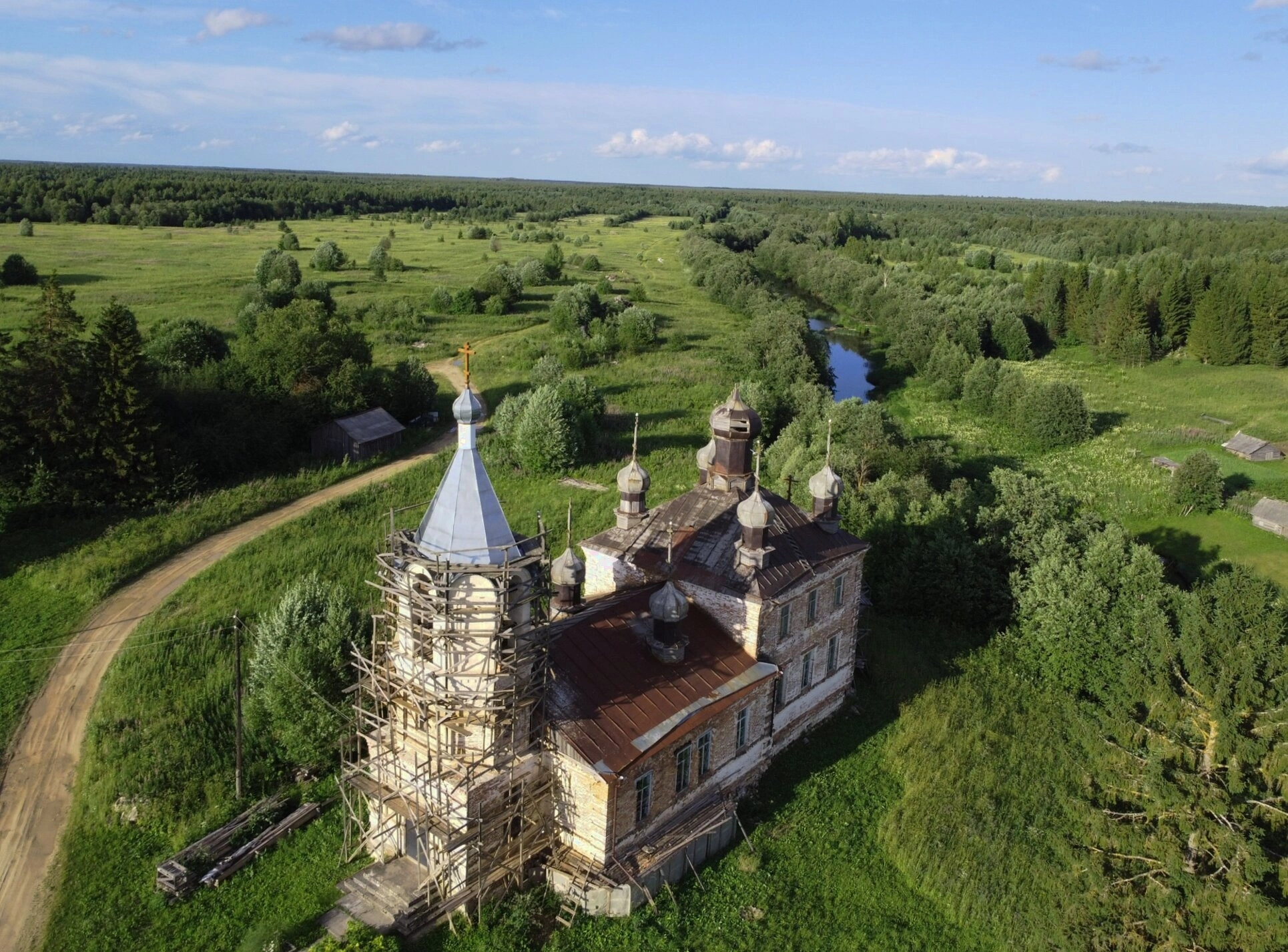 Вдали, среди деревьев, просматриваются скромные деревянные строения, характерные для сельской местности. Ясное небо с легкими облаками подчеркивает величие православной святыни. Этот храм является не только духовным центром, но и важным историко-культурным наследием Русского Севера, свидетельствующим о глубоких православных традициях этого края.