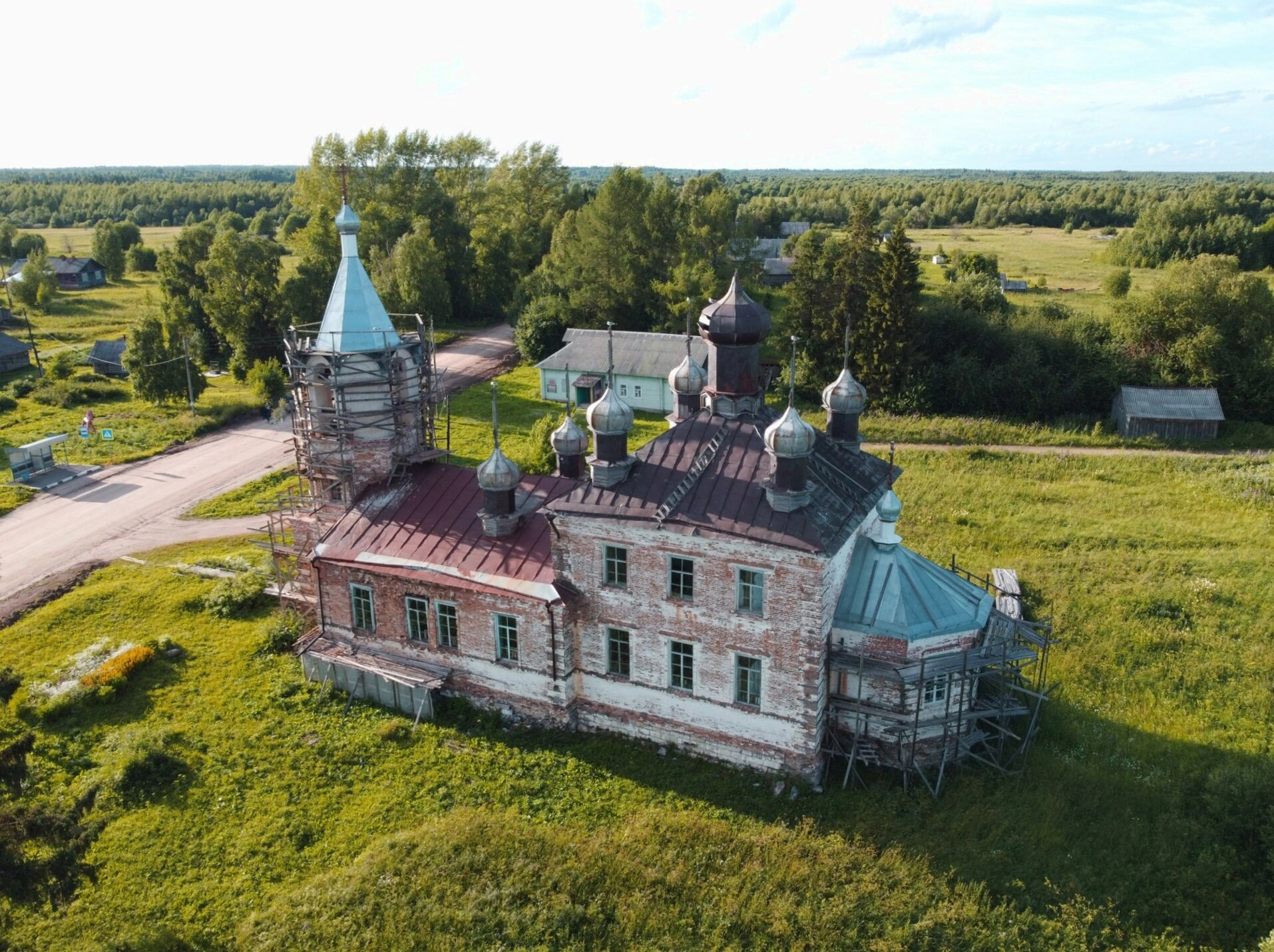 На фотографии видно текущее состояние храма, которое требует незамедлительных реставрационных работ. Вокруг колокольни установлены поддерживающие леса, что свидетельствует о попытках сохранения сооружения. Стены и кровля частично обветшали под воздействием времени и сурового северного климата. Храм окружён типичным для русского севера пейзажем: зелёными полями, лугами и деревьями, что создаёт атмосферу благоговения перед стойкостью православной святыни.