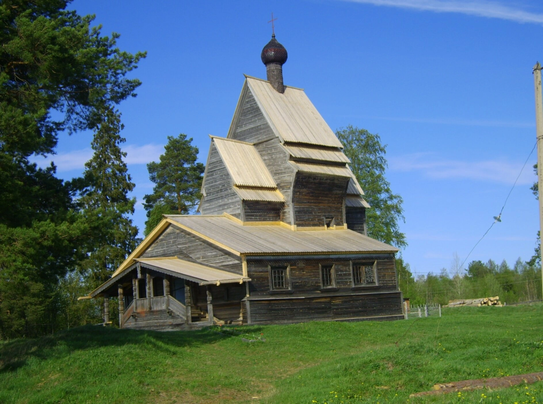 На фотографии запечатлена старинная деревянная церковь во имя святого великомученика Георгия Победоносца, расположенная в деревне Родионово Подпорожского района Ленинградской области. Храм является выдающимся памятником русского северного деревянного зодчества и объектом культурного наследия.