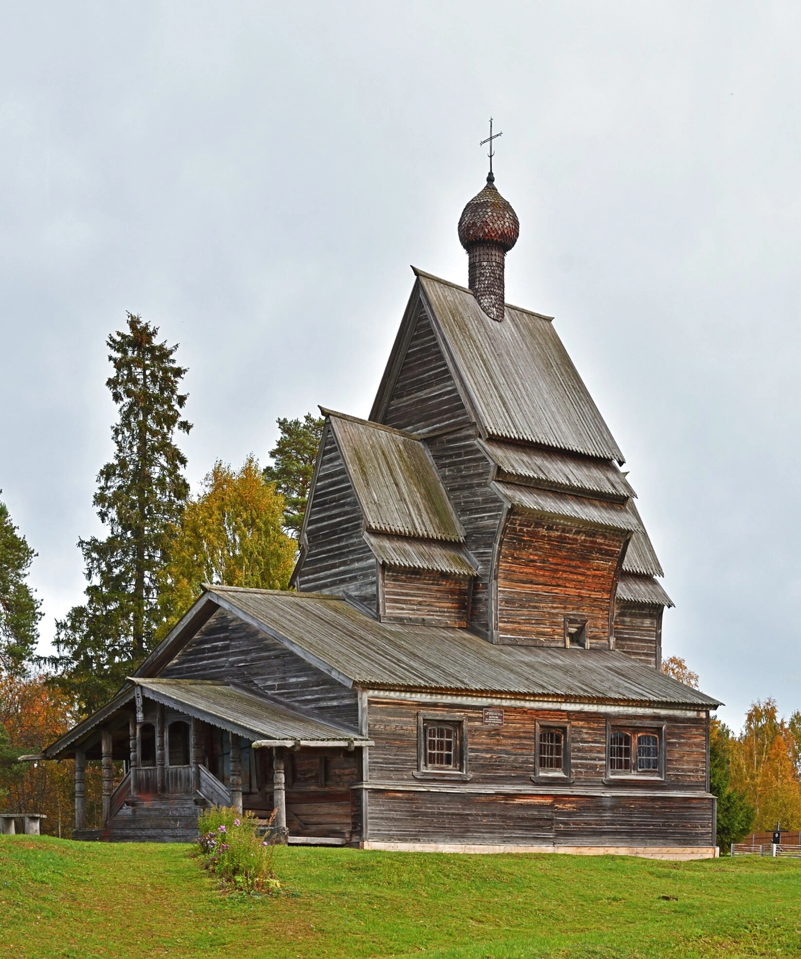 На представленной фотографии запечатлена Церковь во имя святого великомученика Георгия Победоносца, расположенная в древней деревне Родионово на восточном берегу Юксозера. Этот уникальный памятник деревянной храмовой архитектуры был возведён в 1693 году и является одним из немногих уцелевших образцов древнерусского зодчества на территории Ленинградской области.