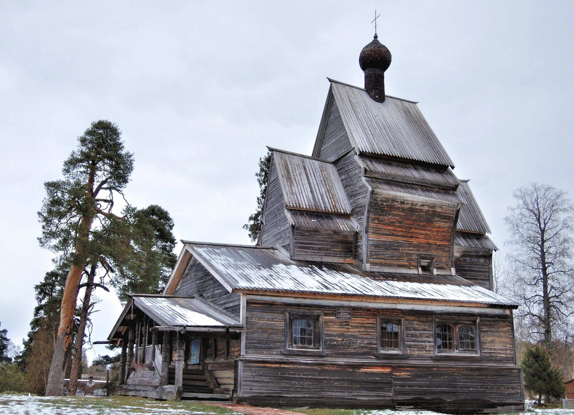 На представленной фотографии запечатлена Церковь во имя святого великомученика Георгия Победоносца, расположенная в деревне Родионово Подпорожского района Ленинградской области. Этот уникальный православный храм является одним из древнейших деревянных сооружений на территории России, сохранившихся на своём исконном месте.
