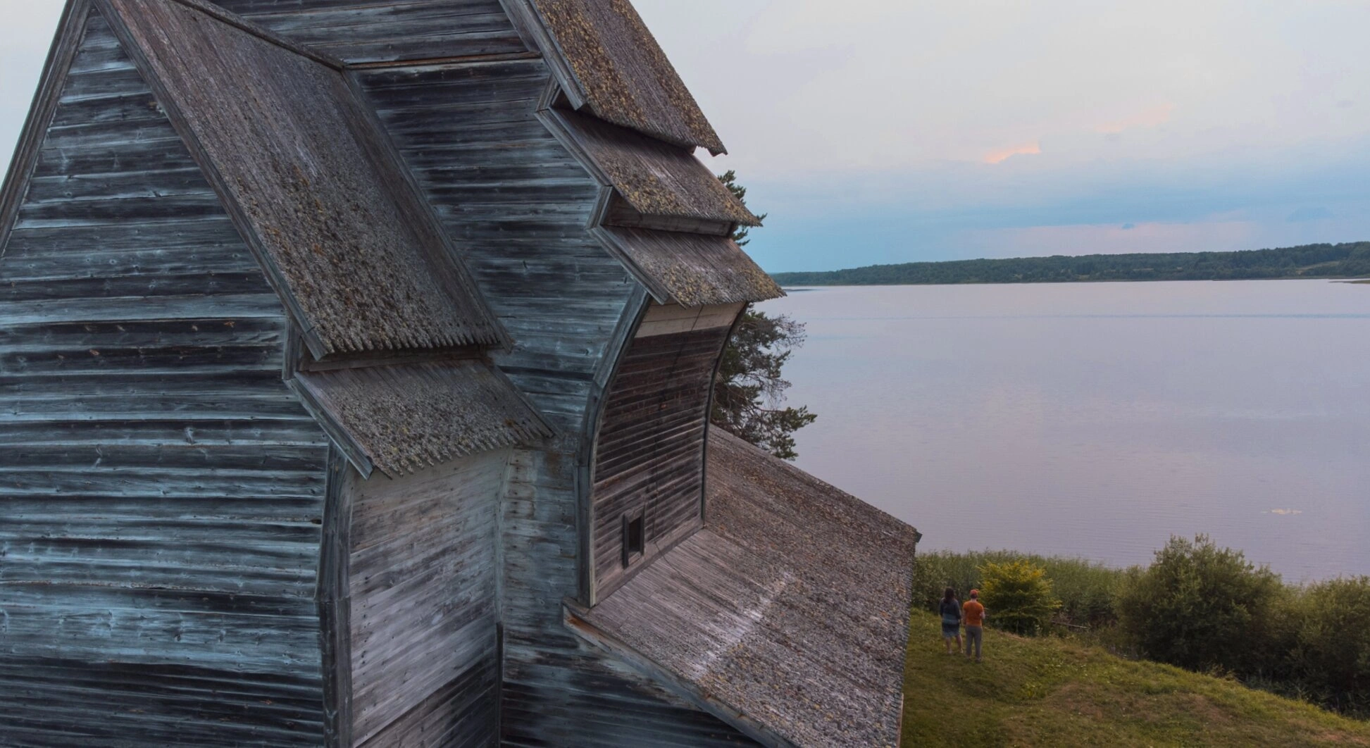 На представленной фотографии запечатлена Церковь Великомученика Георгия Победоносца, расположенная в деревне Родионово на берегу Онежского озера. Этот уникальный памятник русского деревянного зодчества был возведён в конце XVIII века и представляет собой классический образец клетского храма с шатровым завершением.