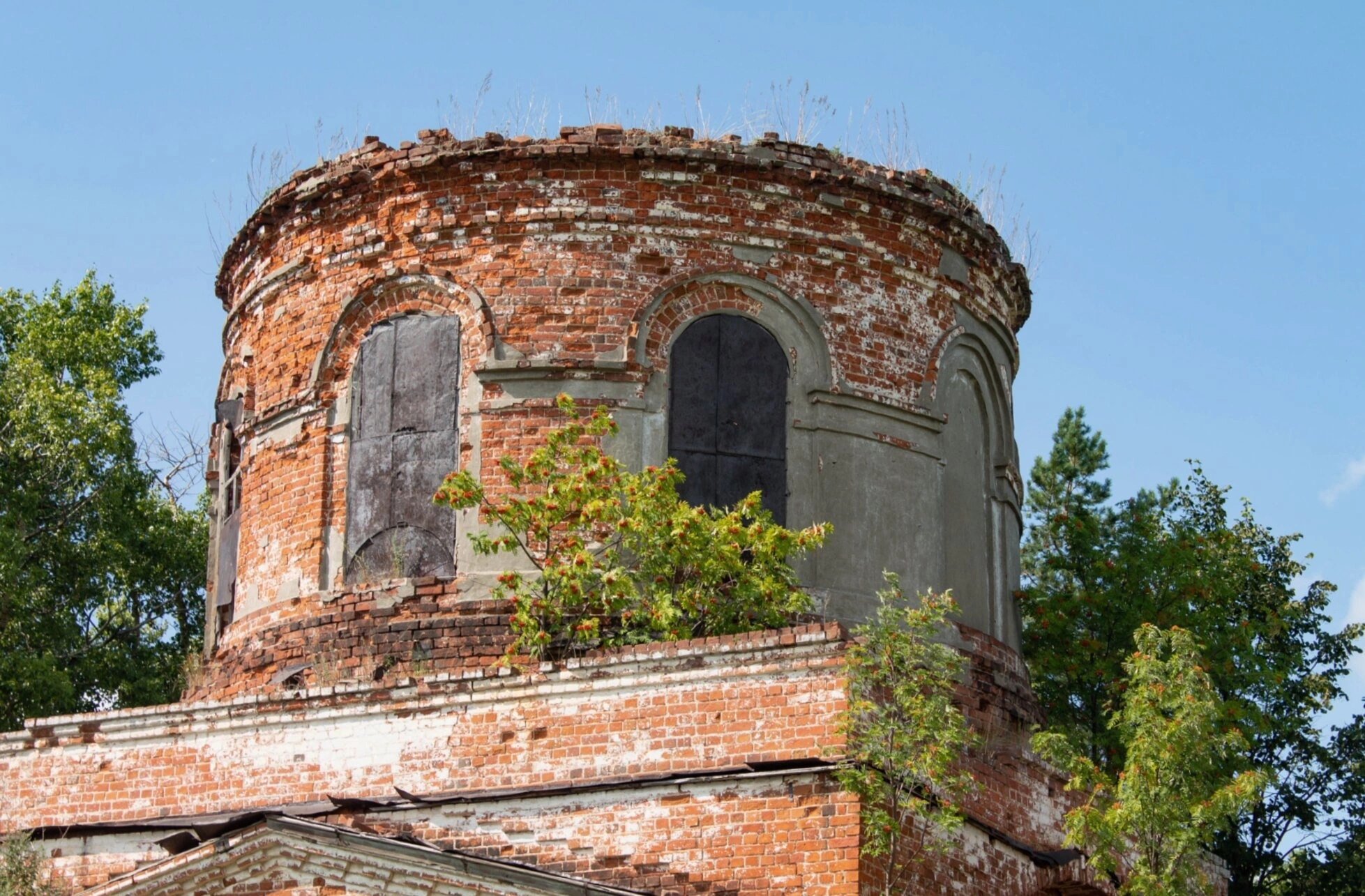 К сожалению, в XX веке церковь, как и многие другие святыни, постигла печальная участь. После закрытия и осквернения в годы богоборчества здание постепенно пришло в запустение. На фотографии видны следы разрушения: утрачены кровля, кресты и внутреннее убранство, однако даже в таком состоянии храм сохраняет свою архитектурную выразительность и духовную силу.