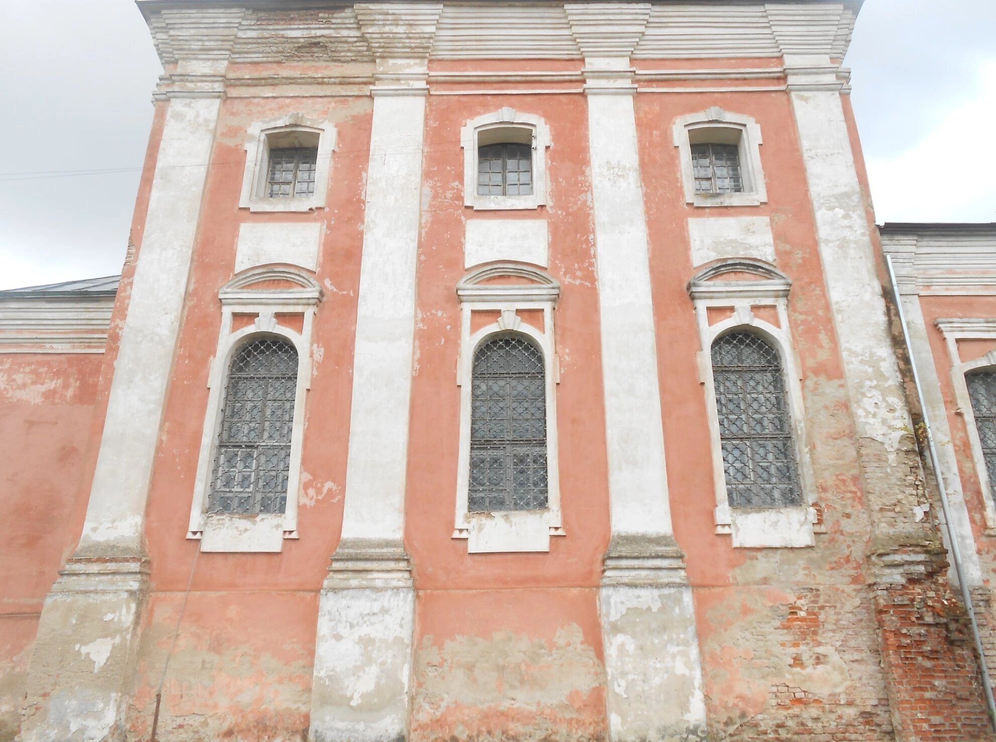 На главном фасаде расположены два яруса окон. В нижнем ряду присутствуют три высоких арочных окна, украшенных изящными белыми наличниками и защищенных коваными решетками. Над ними размещен второй ярус из трех прямоугольных окон меньшего размера, что характерно для традиционной церковной архитектуры.