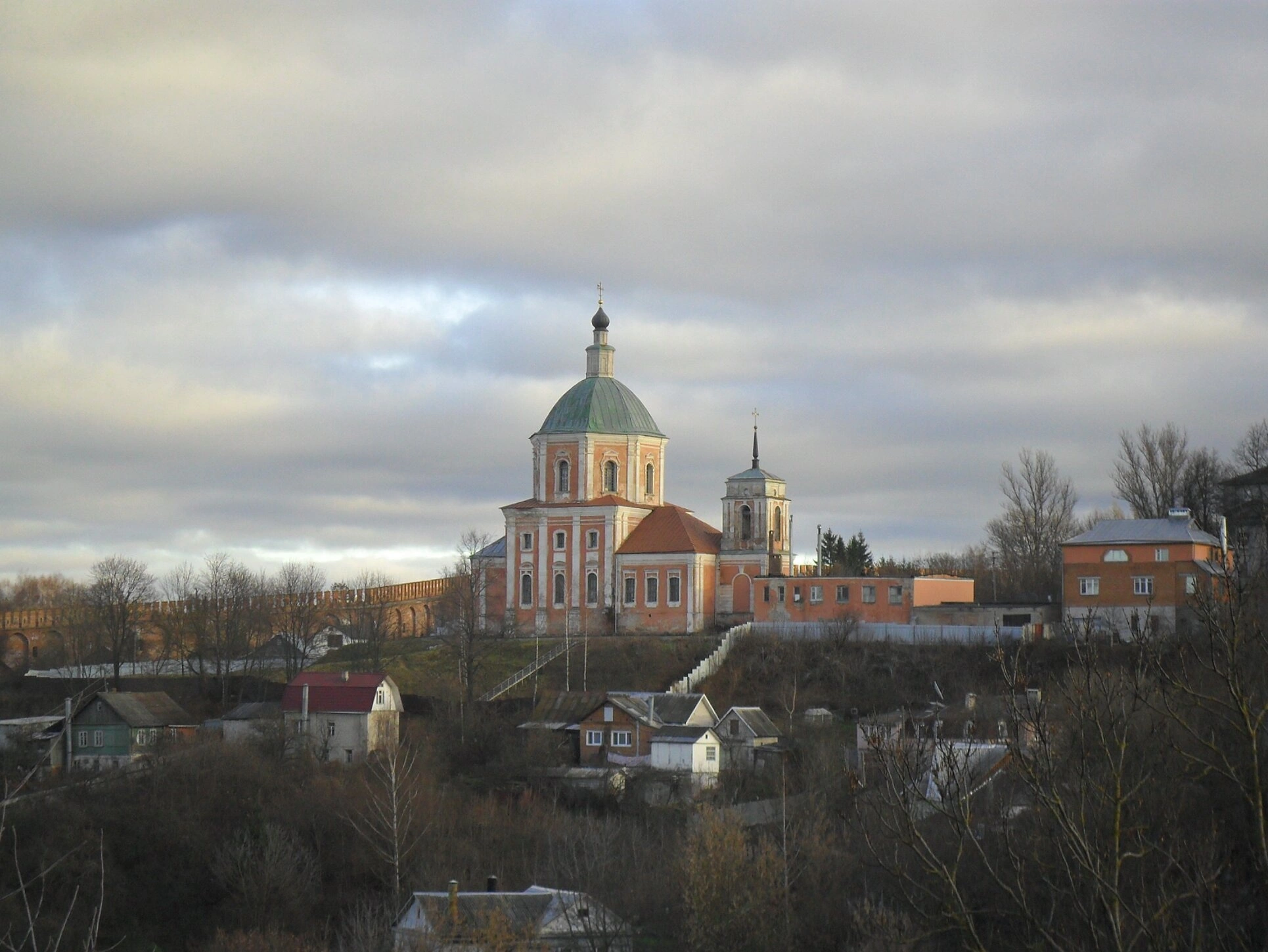 На заднем плане фотографии виден фрагмент легендарной Смоленской крепостной стены, что подчёркивает историческое значение места и связь духовного и оборонного назначения сооружений. Деревья без листвы указывают на осенне-зимний период, когда природа пребывает в состоянии покоя и ожидания обновления. Облачное небо с просветами создаёт особую световую атмосферу, напоминая о Божественном свете, проникающем в земную действительность.