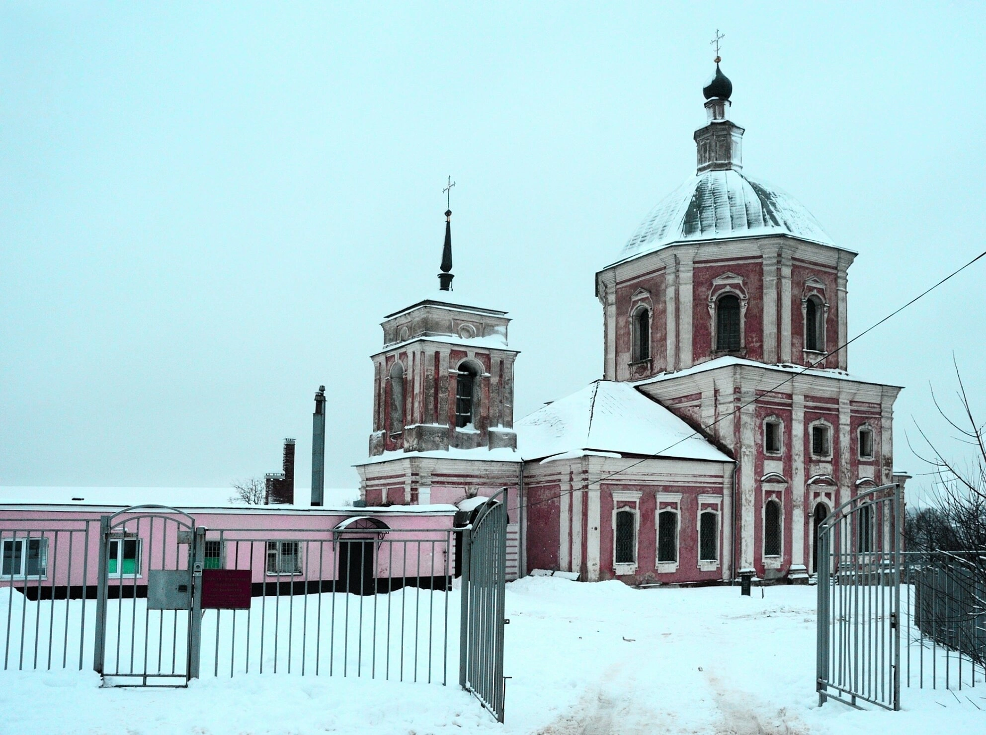 На переднем плане фотографии виден металлический забор с входными воротами, отделяющий церковную территорию. Рядом с историческим зданием храма располагается одноэтажное строение розового цвета, создающее интересный контраст с основным архитектурным ансамблем. Отсутствие листвы на деревьях позволяет в полной мере рассмотреть благородные пропорции православной святыни.