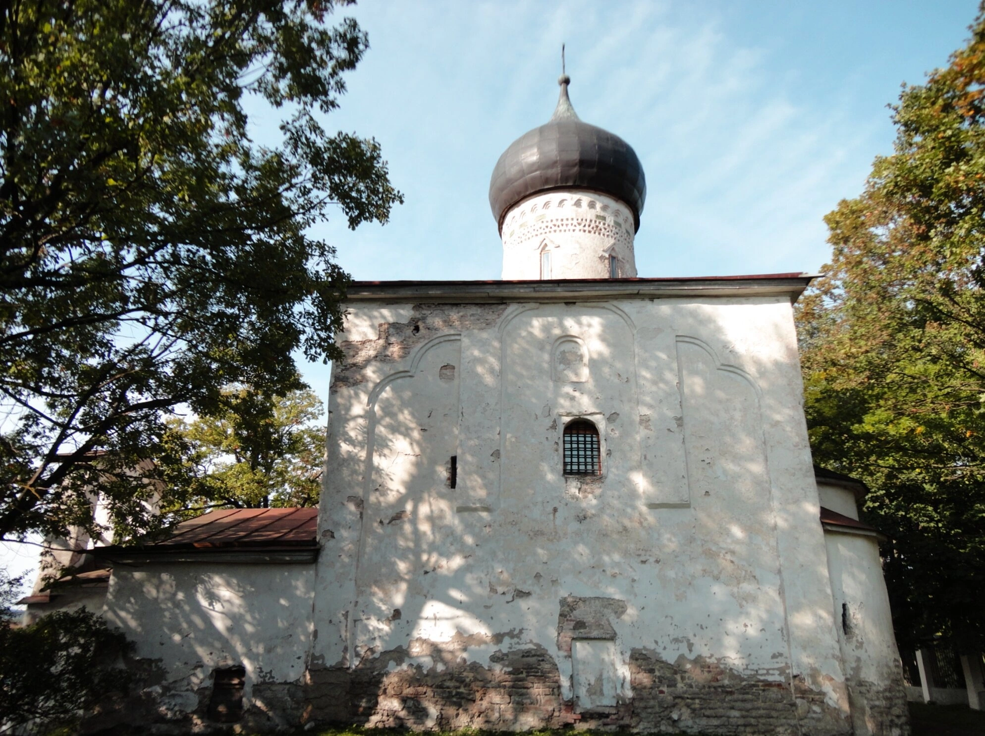 На представленной фотографии запечатлён старинный православный храм — Церковь великомученика Георгия Победоносца, что со Взвоза, в древнем Пскове. Этот четырёхстолпный трёхапсидный одноглавый храм является выдающимся памятником псковской архитектурной школы XV столетия и располагается на живописном берегу реки Великой.