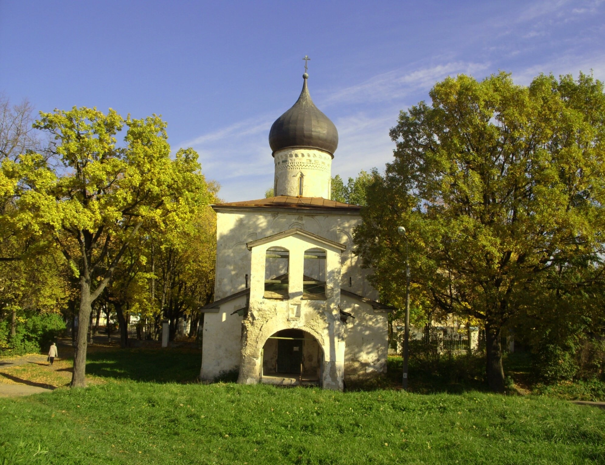 На представленной фотографии запечатлён древний православный храм — Церковь Великомученика Георгия Победоносца, что со Взвоза, в граде Пскове. Святыня, возведённая в 1494 году на берегу реки Великой, является выдающимся памятником псковского зодчества и осенена тихой, умиротворяющей благодатью.