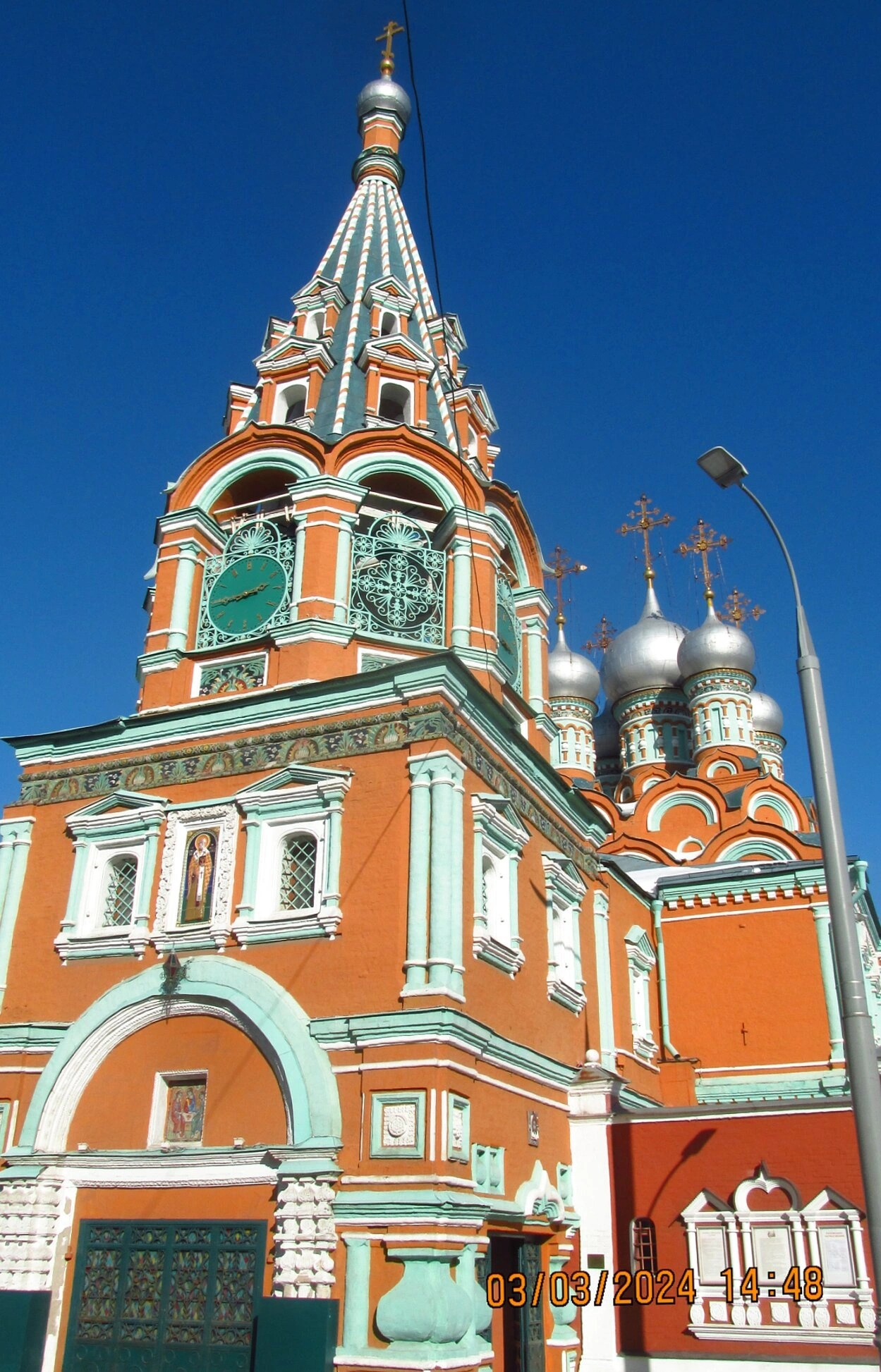 Особого внимания заслуживает колокольня храма, на которой установлены часовые механизмы с синими циферблатами и золочёными стрелками. Храм был возведён в 1679 году по благословению духовника царя Алексея Михайловича — протопопа Андрея Савинова. Руководство строительными работами осуществляли подьячие Иван Волжинский и Карп Губа, а наблюдение за художественным оформлением — иконописец Иван Рыкачев.