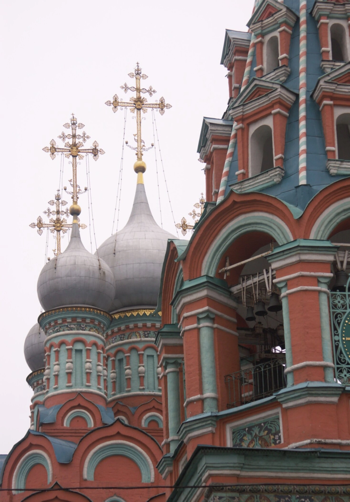На переднем плане изображения возвышаются изящные купола храма, покрытые серой чешуйчатой черепицей и увенчанные златоглавыми крестами с тончайшими ажурными элементами. Главный купол, окружённый четырьмя меньшими главами, символизирует Иисуса Христа и четырёх евангелистов, что соответствует канонам православной храмовой архитектуры.