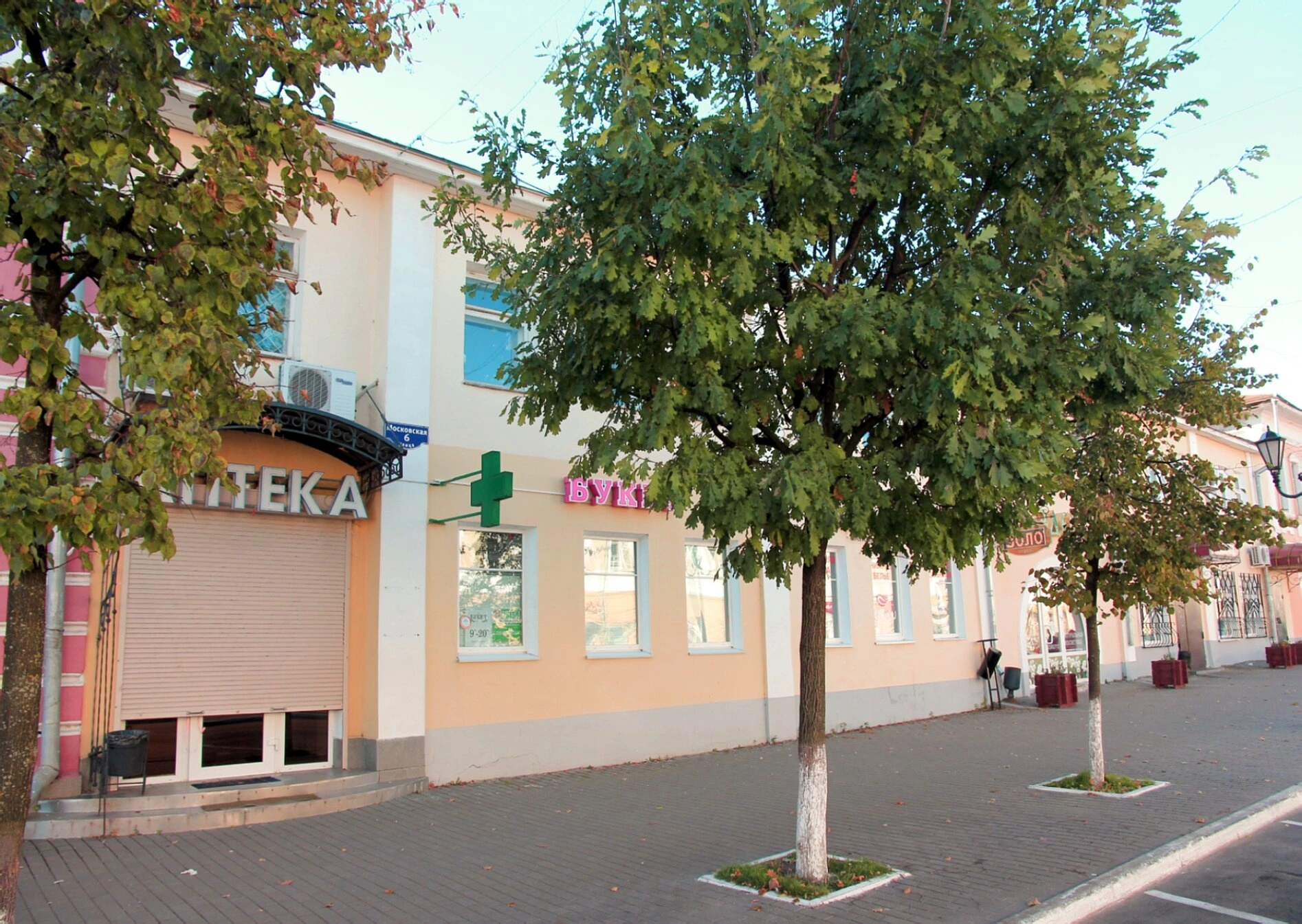 Двухэтажное здание светло-желтого цвета, изображённое на снимке, представляет собой архитектурный памятник XIX столетия. На первом этаже святого здания располагается аптека, о чём свидетельствует соответствующая вывеска и зелёный крест — символ врачевания и помощи страждущим. Окна нижнего яруса закрыты защитными рольставнями, что сохраняет внутреннее убранство помещения.