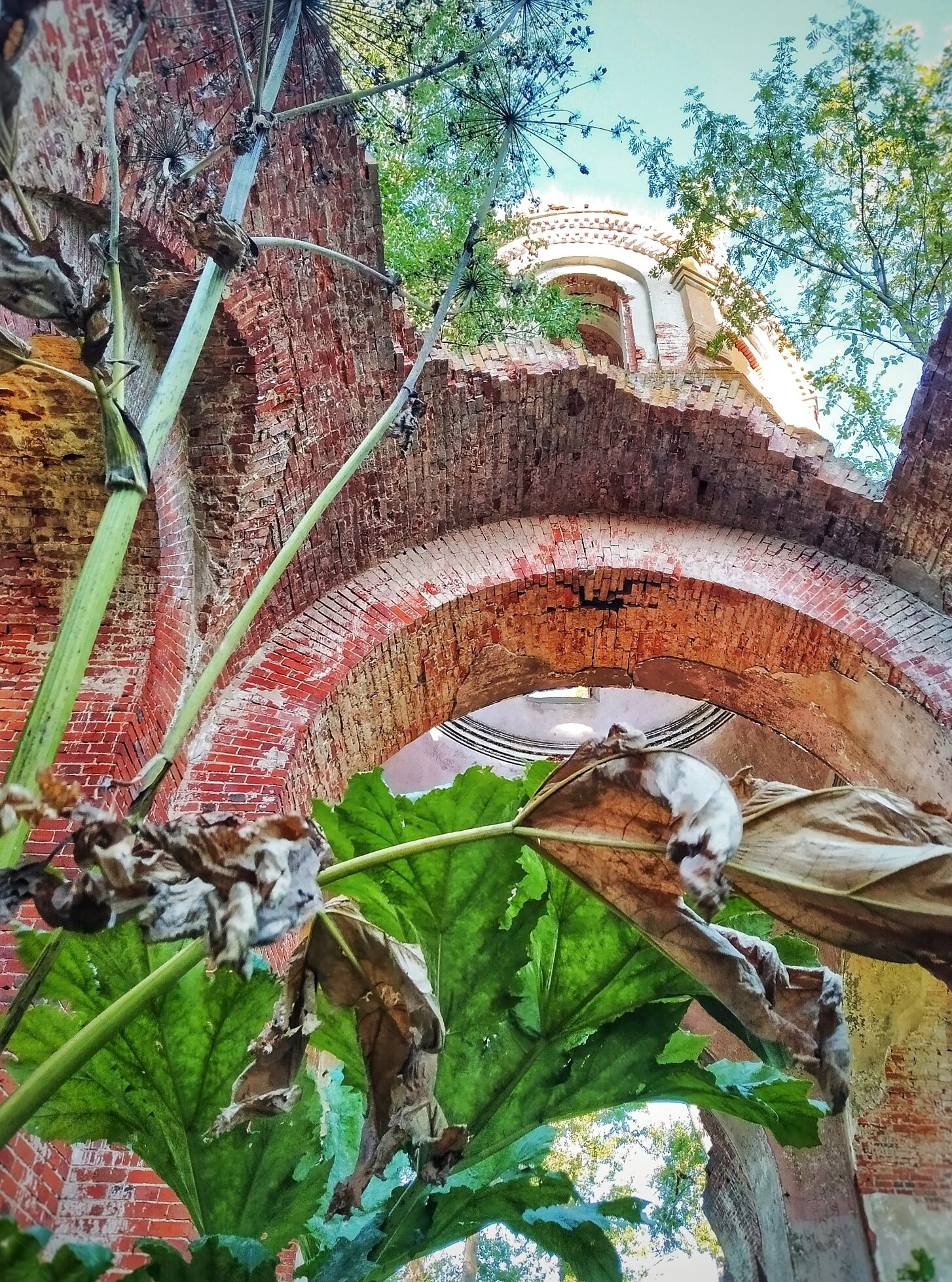 Природа постепенно поглощает творение человеческих рук - внутри храмового пространства и вокруг него разрослись дикорастущие растения. Особенно заметны крупные листья борщевика и молодые деревья, чьи корни постепенно разрушают оставшиеся конструкции. Эта картина символизирует быстротечность земного бытия и напоминает о словах Спасителя: «Не собирайте себе сокровищ на земле, где моль и ржа истребляют и где воры подкапывают и крадут» (Мф. 6:19).